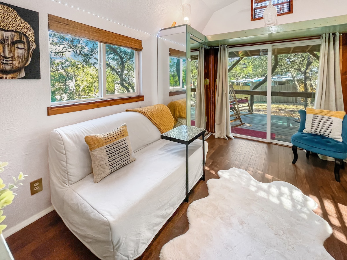 ¡Da la bienvenida a nuestra cabaña Zen! ¡Una minicasa colorida, tranquila y artísticamente diseñada escondida en la parte trasera de nuestra propiedad de 4 acres y justo en medio de toda la acción en Texas Hill Country! ¡Estamos a solo 4 millas del famoso "Tubing on the Horseshoe" y "Whitewater Amphitheater", y a solo 2 millas del sendero de acceso al río Guadalupe. ¡La cabaña Zen es un espacio cálido y moderno, equipado con lavadora/secadora, TV, barbacoa y cocina completa!