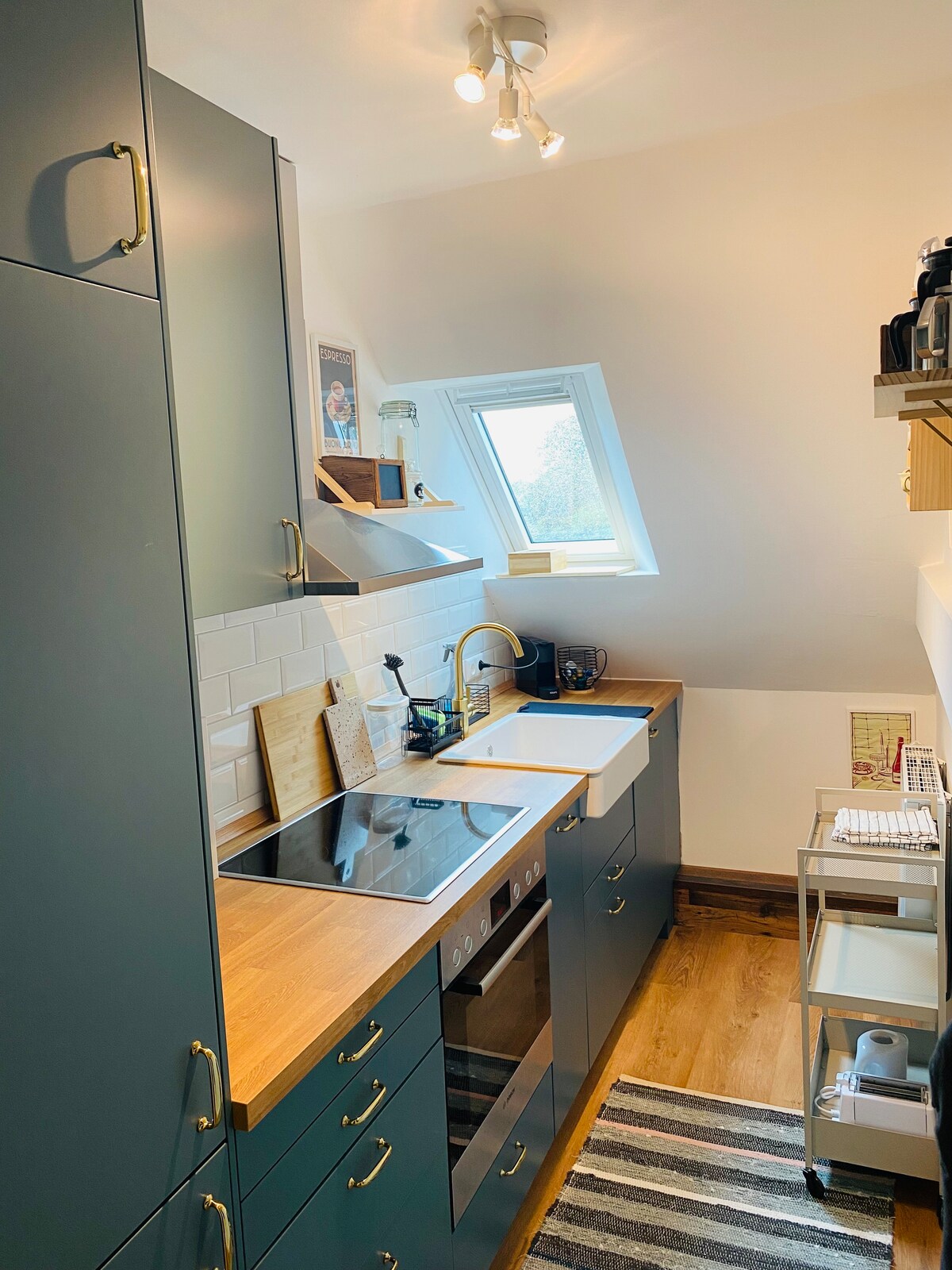 Bienvenidos a nuestro encantador apartamento tipo estudio con dormitorios adicionales. Se encuentra en el ático de un hermoso edificio de 1900 y tiene su propia entrada, a través de la cual se puede entrar y salir sin molestias cuando se desee. El apartamento tiene una cocina espaciosa y una gran sala de estar con TV incl. acceso a Netflix. También quien tenga algo que hacer encontrará un escritorio con LAN / WLAN. Además, tienes tu propia pequeña zona de jardín con mesa y sillas.