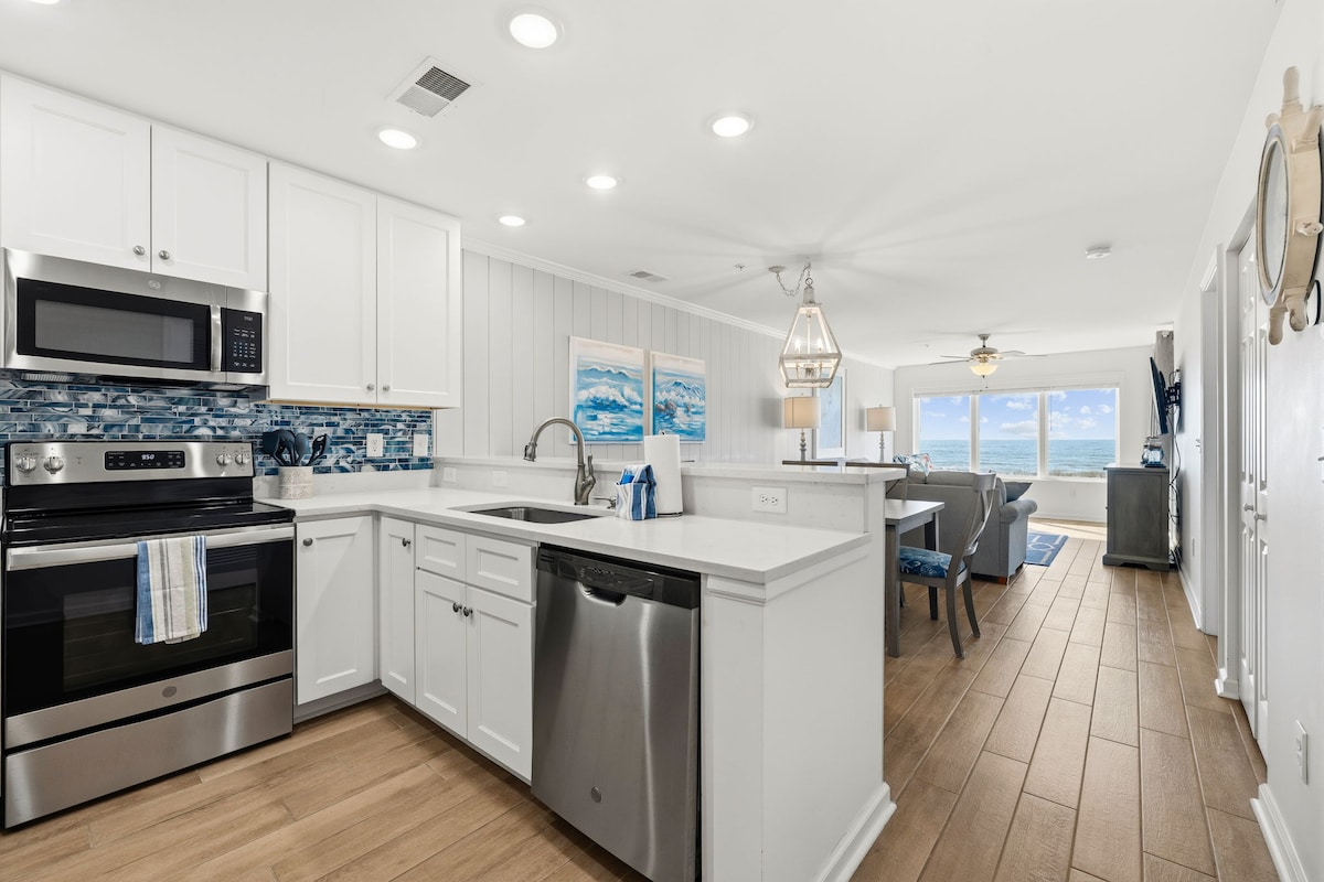 Este espectacular condominio con vistas al mar y renovaciones de primera categoría se encuentra a solo unos pasos de la playa. Déjate llevar por la vista de las olas ondulantes, las capas blancas y el muelle de OKI mientras te relajas y disfrutas de una bebida en el balcón. También disfrutarás de una impresionante puesta de sol, ya que los colores cambian cada minuto a través del cielo. Retirate en la sala de estar y descansa los pies cansados en un cómodo sofá seccional mientras interactúas con otros en un entorno de planta abierta estéticamente agradable.