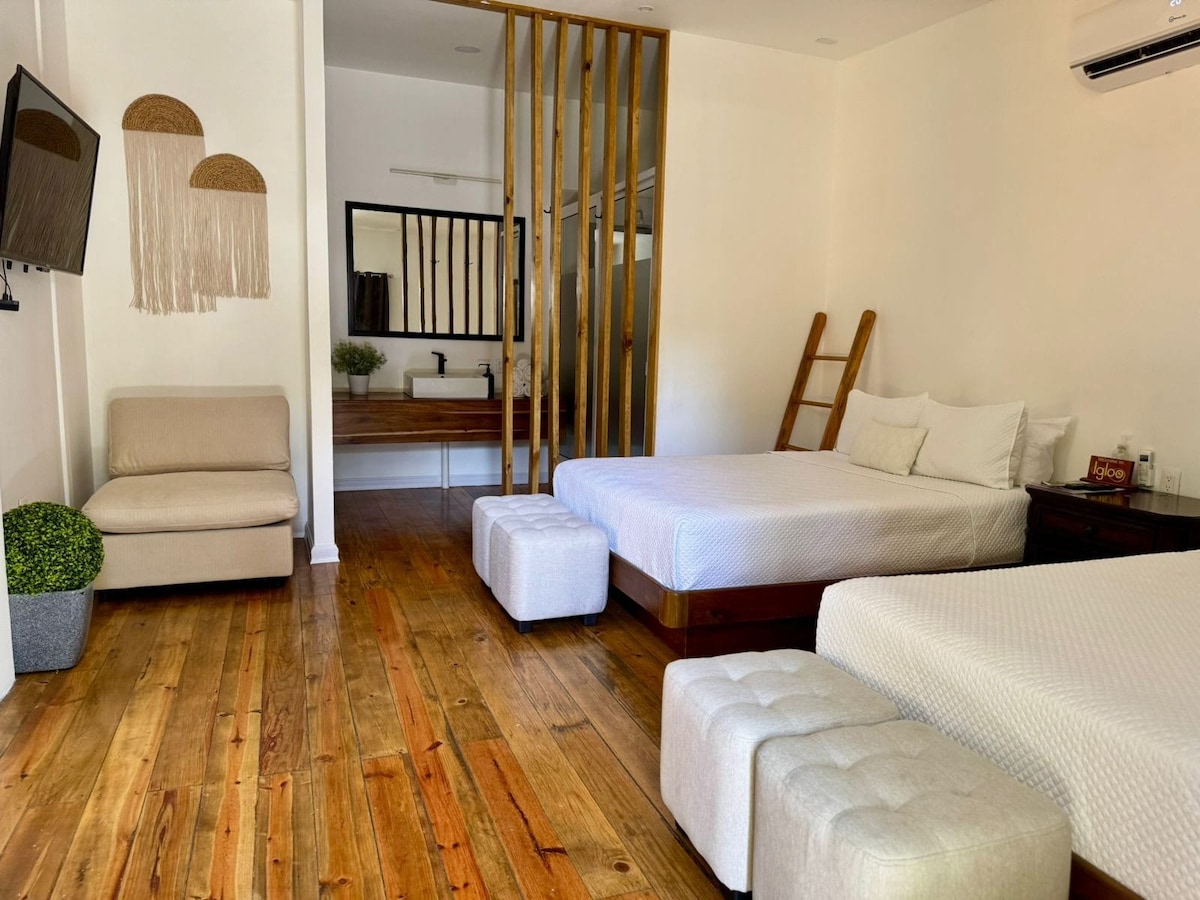 La Habitación #01 en Igloo Island Domes ofrece un refugio amplio y tranquilo en Utila, ideal para familias o parejas. Esta cómoda habitación cuenta con dos camas queen y un baño privado, brindando una estadía placentera con aire acondicionado y sábanas limpias. Los huésped tienen acceso a la piscina al aire libre, la terraza soleada. Ubicada cerca del Dream Ferry y restaurantes locales, la propiedad ofrece hospitalidad personalizada para una experiencia inolvidable.