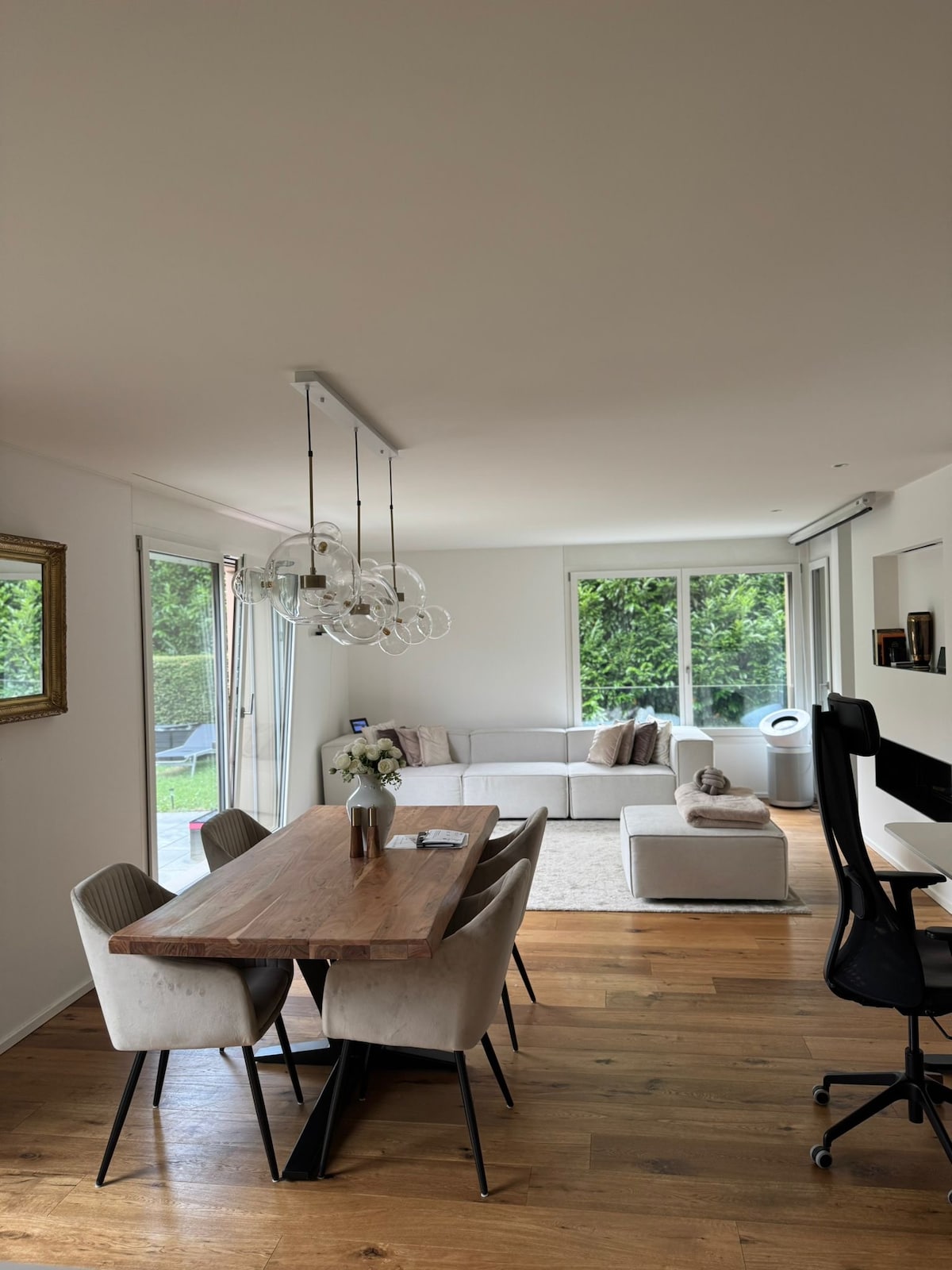Sehr schöne und helle Wohnung mit luxuriösem Ausbaustandard. Lage ist perfekt, 3 Minuten zur Autobahn oder 5 Minuten zu Fuß zum Zug. 12 Minuten nach Zürich. 180m², im Parterre mit Lift zur Garage und eigener Waschküche, 1 Master Bedroom, 1 Kinderzimmer, 1 offenes Büro, rollstuhlgängig, mit Kamin/Cheminée, zwei Terrassen, Tiefgarage, alle Wohnräume mit Parkett... Familien mit Kindern willkommen, Rauchen und Parties in der Wohnung nicht erlaubt.