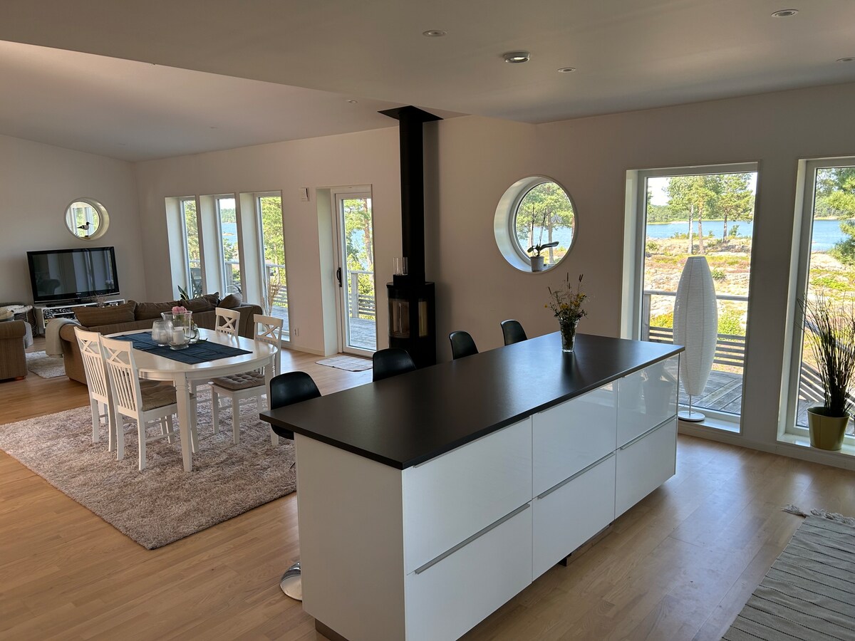 Villa Kruthuset es una casa de vacaciones de nueva construcción (2023) con un toque personal y una ubicación única y aislada para reuniones y encuentros. Ubicado en el archipiélago exterior y la Reserva Natural de Femöre con la posibilidad de una estancia activa y tiempo para la recuperación. Disfruten de una sauna, kayak o cocinen juntos. Hay mucho espacio para socializar y cenas encantadoras, así como la posibilidad de cerrar la puerta (7 dormitorios - 8 camas, incluyendo ropa de cama y toallas). ¡Se trata de una cálida bienvenida!