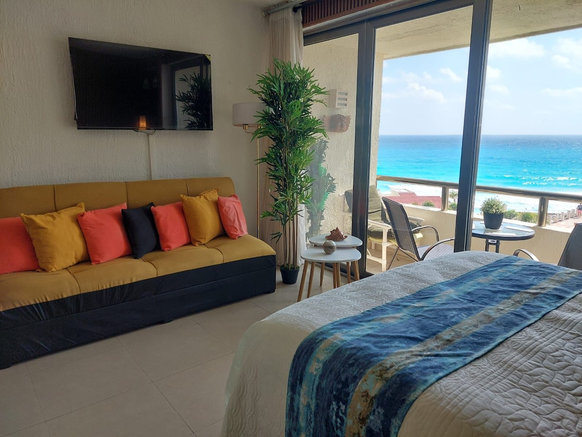 The studio is located at the best beach area in Cancun, you will enjoy its spectacular caribbean ocean view with its baby blue waters!. It is right on the beach with easy access. It is good for couples, solo adventurers and families (with kids), best for maximum 4 adults and one child. I have the contact for you to be able to get COVID tested to go back home and I will be happy to help you.