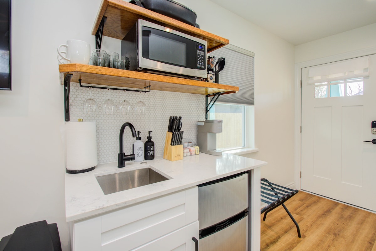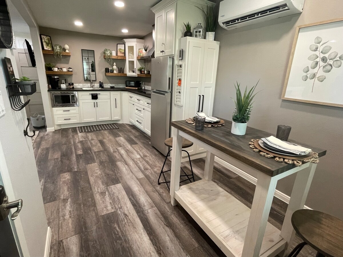 Te invitamos a alojarte en esta impresionante joya escondida dentro del bucle. Nuestra moderna y contemporánea casita de unos 470 pies cuadrados es el oasis privado perfecto desde casa. Se encuentra en un terreno de 10 000 pies cuadrados y cuenta con una larga entrada perfecta para vehículos grandes, remolques pequeños o vehículos recreativos. Acceso directo para facilitar la descarga y el control del vehículo. Reformada en el verano de 2022. Esta casa totalmente equipada ofrece privacidad con un toque de lujo diseñado pensando en ti. ¡Ofrecemos configuraciones especiales para todas las ocasiones!