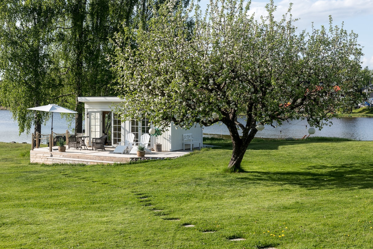 Después de una maravillosa noche en la casa del jardín, el desayuno se sirve en el muelle junto al gran estanque. Con una taza de café recién hecho en la mano, puedes ver el hermoso parque donde siempre hay algo emocionante para descubrir. Con las aguas brillantes del lago Mälaren a solo un corto paseo, es fácil sentirse tentado a darse un chapuzón en Stockbybadet. Estamos cerca de la ciudad, pero aún en el campo y a poca distancia de una tienda de comestibles y una hermosa pastelería, por lo que es posible quedarse un poco más.