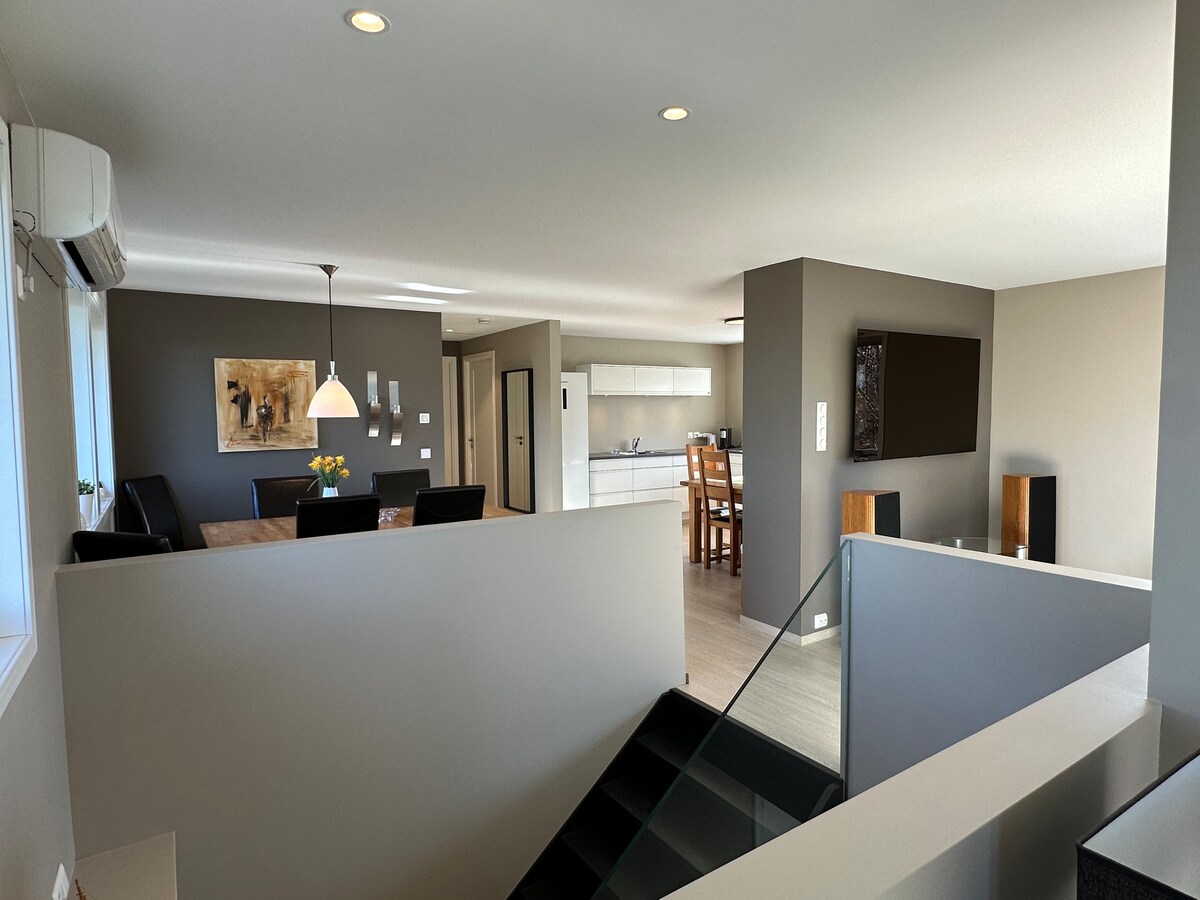 Una casa de campo de 2017 con hermosas vistas al mar que se puede disfrutar desde los grandes ventanales o desde el jacuzzi en la terraza. El interior tiene colores naturales tranquilos, de estilo nórdico. Chimenea en la sala de estar, solución abierta desde la cocina. 1er piso: 2 dormitorios, 2 baños, sala de estar y cocina, así como lavandería y pasillo. Segundo piso: 2 dormitorios y loft con sofá cama doble. Un total de 14 camas y camas de viaje. Cualquier colchón adicional para el piso. Grandes oportunidades de senderismo cerca, alquiler de barcos, así como una bonita playa de arena debajo del hotel y centro vacacional Panorama cerca.