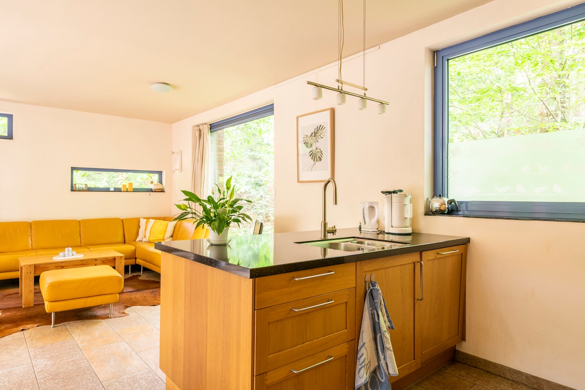 Moderno bungalow en el bosque de la Campina de Brabante, perfecto para disfrutar de la paz y la naturaleza. Disfruta del desayuno en la terraza mientras las ardillas saltan entre los árboles. Camina o pedalea directamente hacia la naturaleza y, después, relájate junto a la estufa de leña o en el jacuzzi de leña (opcional, disponible para reservar). El bungalow está situado en una zona tranquila, en un pequeño parque, cerca del encantador pueblo de Bladel y de varios pubs acogedores. En resumen, un lugar maravilloso para una estadía relajante en la campiña de Brabante.