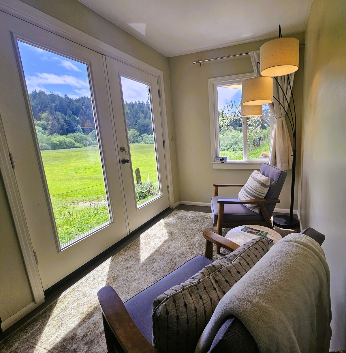 Te damos la bienvenida al Starlight Studio,🌟 una tranquila escapada a Arcata. Disfruta de las hermosas vistas al bosque de secuoyas, playas cercanas, con privacidad y comodidades. Este adorable estudio privado está completamente amueblado con amplia luz natural, una entrada privada para huéspedes y patio. ¡El lugar de retiro perfecto para los viajeros! Disfruta de la cama tamaño queen y la ropa de cama de algodón. La cocina tiene un fregadero, nevera/congelador retro, encimera, microondas, horno tostador, platos, cubiertos, hervidor eléctrico, cafetera surtida y barra de té. Limpieza ecológica