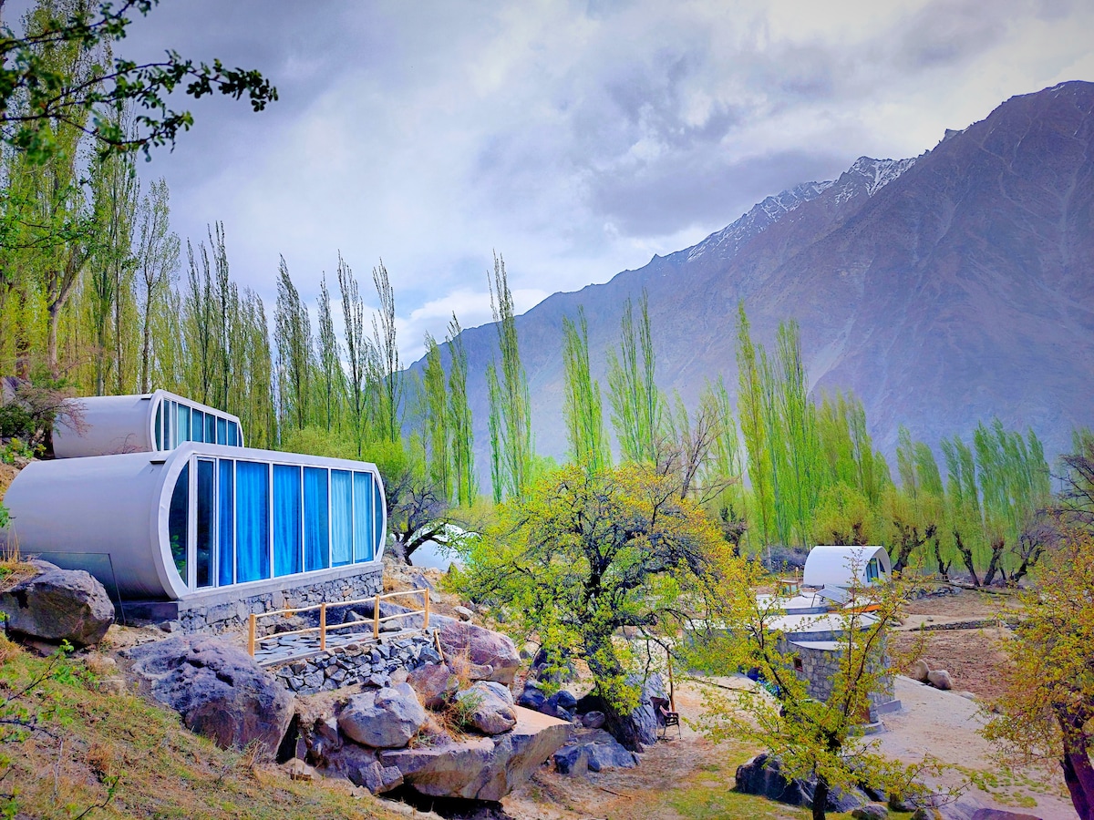 Premium solar-powered loft in Chamangul, Upper Hunza. Wood-and-metal design, panoramic mountain and river views, Wi-Fi, kitchenette, and outdoor bonfire area. Ideal for adults seeking quiet, creativity, and sustainable living. At night, enjoy the calm view of Gulmit Bridge lights across the valley.