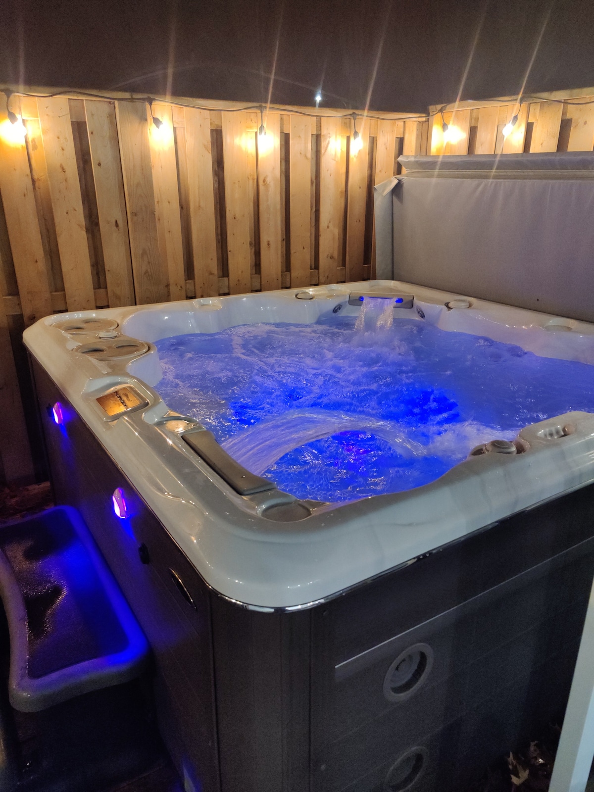 Jacuzzi resplandeciente en la oscura Sala de juegos Firepit Rooftop
