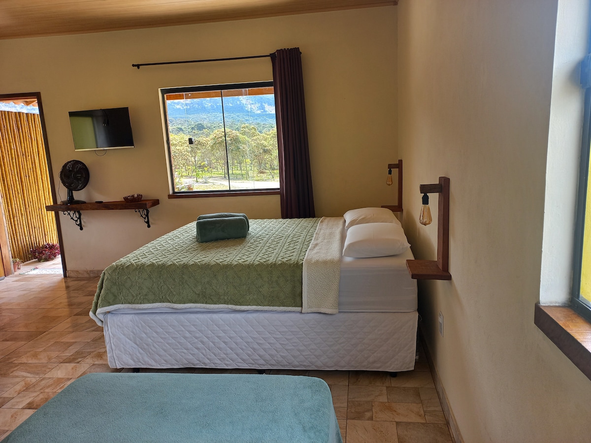 Chalets para 2, 3 o 4 personas en Recanto Cachoeiras de Ibicoara cerca de las cascadas Buracão y Fumacinha. El espacio se encuentra en Campo Redondo, una zona privilegiada de Ibicoara con vistas a las montañas más hermosas de Chapada Diamantina. Chalet con cocina y baño. Ducha de agua caliente y fuerte. Agua mineral en todos los grifos. Ventilador. Una hermosa y cómoda cama tamaño queen y una cama individual. Y para disfrutar de la vista y la naturaleza, un hermoso balcón con un toldo y una hamaca.