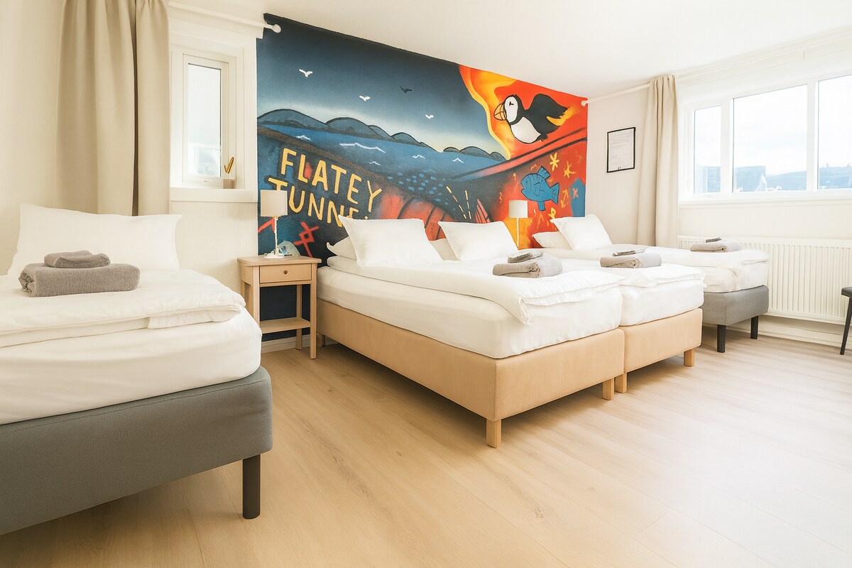 Luminosa habitación familiar con una cama doble y dos camas individuales, baño privado y desayuno bufé incluido en un colorido hotel de arte en el centro de Stykkishólmur. Camina hasta el puerto, los restaurantes y el ferry Baldur en minutos, luego regresa a la conexión wifi rápida, el estacionamiento gratuito y una habitación tranquila. Un mural de pared completa y detalles divertidos hacen de este un lugar fácil para familias o amigos que viajan por carretera por la península de Snæfellsnes o se dirigen a los fiordos occidentales. El auto check-in facilita las llegadas tardías