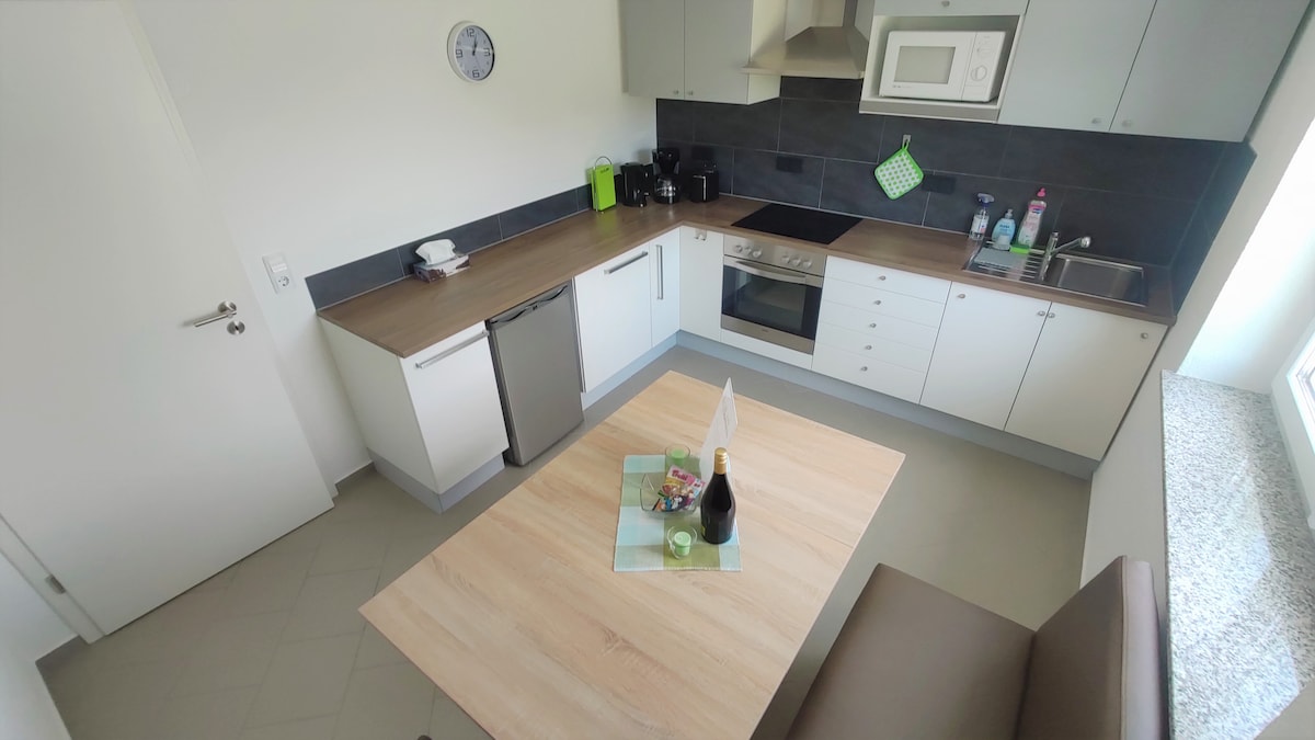 El apartamento (53 metros cuadrados) está ubicado en el sótano de nuestra casa de nueva construcción, tiene una cocina totalmente equipada, baño con ducha e inodoro, dormitorios con cama doble y sofá cama, así como un sofá con función para dormir en la sala de estar. Una escalera conduce al apartamento y puede sentarse cómodamente en el patio y la parrilla...