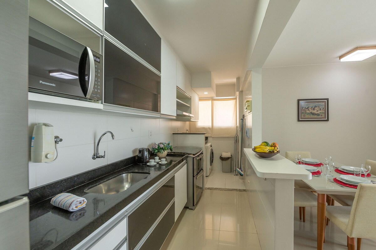 Situado frente a la playa, cerca de SmartFit, Atacarejo, así como cafés y restaurantes. Cuenta con una suite con cama de matrimonio "tamaño queen", otra habitación con dos camas de matrimonio, ambas con aire acondicionado dividido, TV de pago, "Wi-Fi", cocina, área de servicio y balcón, con vistas al mar de todas las habitaciones. Cuenta con seguridad electrónica, un ascensor panorámico, dos garajes para autos medianos, un espacio para niños, una sala de juegos, un espacio gourmet, un gimnasio, un sauna y una piscina.