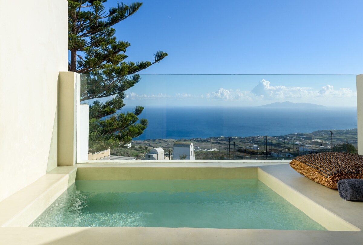 Esta espaciosa suite boutique está encaramada en el punto más alto del pueblo de Imerovigli, y ofrece unas impresionantes vistas despejadas a la famosa Caldera, la puesta de sol y el volcán. Con dos camas tamaño queen y un jacuzzi privado en el balcón, la suite promete momentos inolvidables de relajación y puro disfrute.