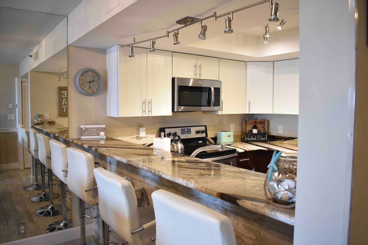 ¡Ven a disfrutar de tu paraíso en este lujoso condominio de playa recién renovado, a solo 40 pasos de la playa! El condominio tiene dos dormitorios con dos baños privados, y una sala de estar con un medio baño adicional. La cocina recientemente actualizada cuenta con nuevos electrodomésticos de acero inoxidable, encimeras de granito y una amplia barra de desayuno. En la sala hay un televisor de 51 pulgadas y 2 sofás cama extraíbles. Aparcamiento privado gratuito para 2 coches. ¡Incluye sillas de playa, sombrillas, toallas y 2 bicicletas!
