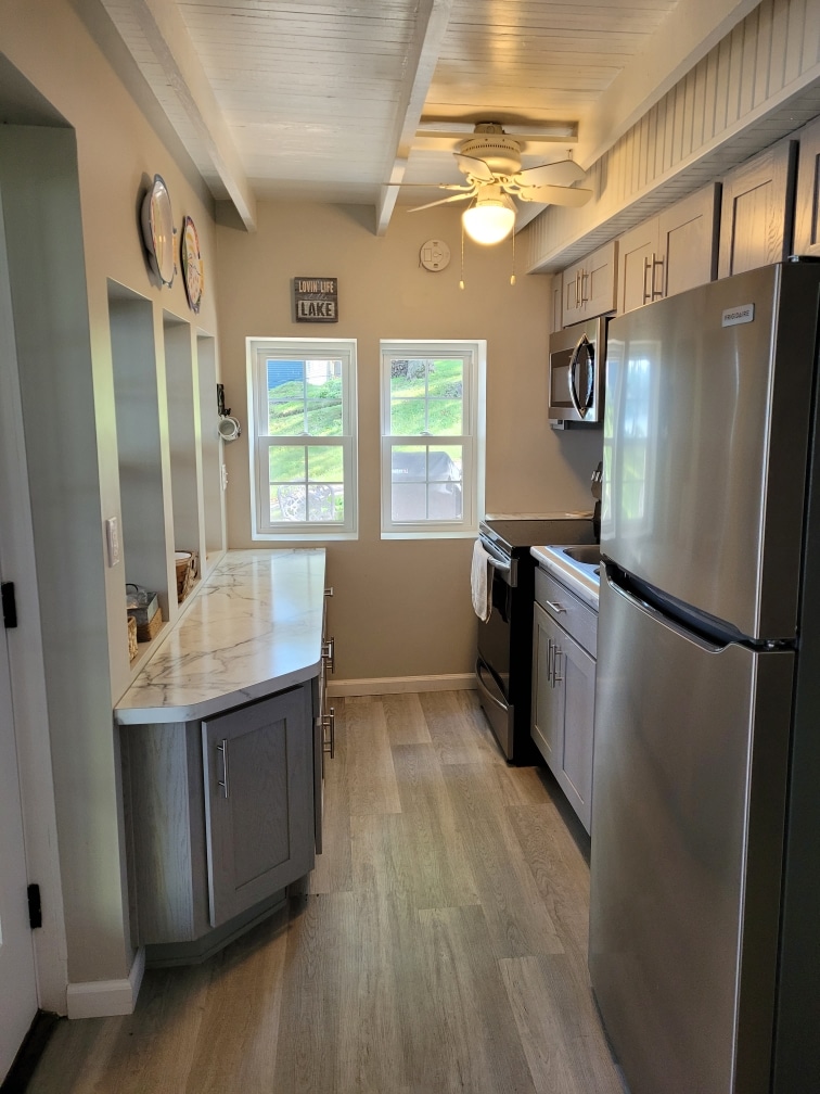 No tienes que haber nacido en un granero para pasar las vacaciones en uno. ¡Cambia la ciudad por millones de estrellas en el cielo nocturno! Al entrar por las puertas francesas, serás recibido por una habitación de concepto abierto decorada con un motivo de granero/industrial. El revestimiento de pino nudoso y acero galvanizado, los suelos de madera junto con un sofá de cuero reclinable y un asiento de dos plazas llenan la habitación. Una cocina completa con encimeras de granito te espera. Hay mucha iluminación natural para las noches.