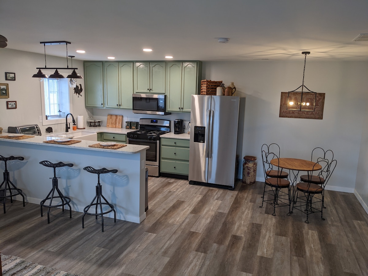 ¡Nueva construcción! Unidad privada completa ubicada en nuestro granero, ahora con un patio privado vallado. En este alojamiento se respira tranquilidad: ¡relájate con toda la familia! Nuestra propiedad se encuentra en una zona rural tranquila, lejos del ajetreo de la ciudad, pero a 15-20 minutos de la vida urbana y de las tiendas. Tu unidad privada se encuentra en nuestro nuevo granero de postes en nuestra granja histórica. Es una unidad de nivel inferior con capacidad para 4 personas y tiene 1 dormitorio y 1 baño.