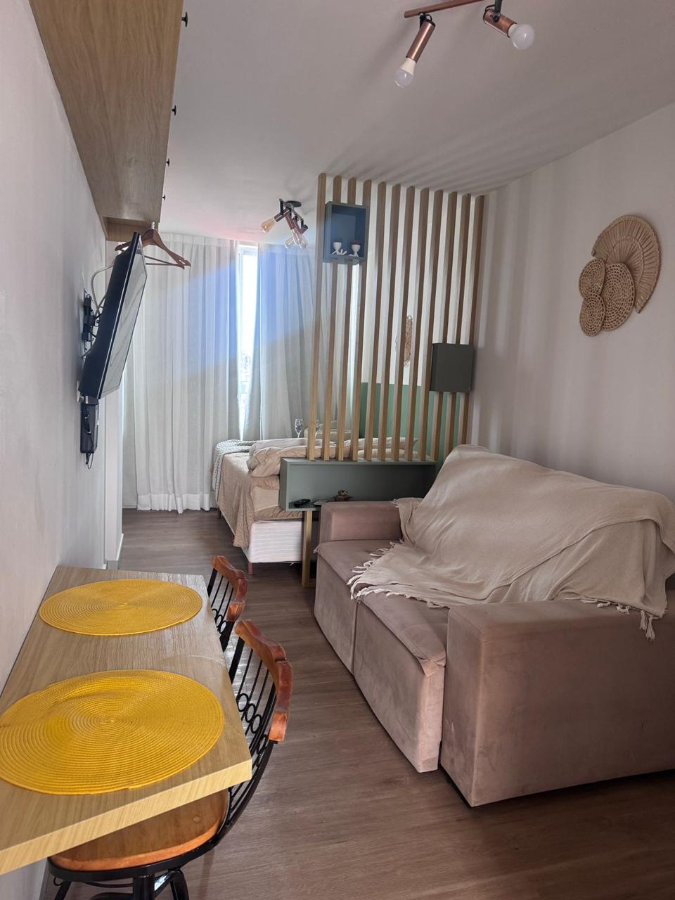 Disfrute de la sencillez y la comodidad en este tranquilo y acogedor apartamento, perfecto para parejas, con capacidad para hasta 4 personas (cama doble y sofá cama disponibles). Situado cerca de la playa, ofrece aire acondicionado, Wi-Fi de 600 Mbps y Smart TV para su comodidad. El condominio cuenta con piscina y una increíble vista al atardecer. Está a pocos pasos de panaderías, farmacias, tiendas, pizzerías y restaurantes. ¡Todo para hacer tu estancia aún más práctica y agradable!