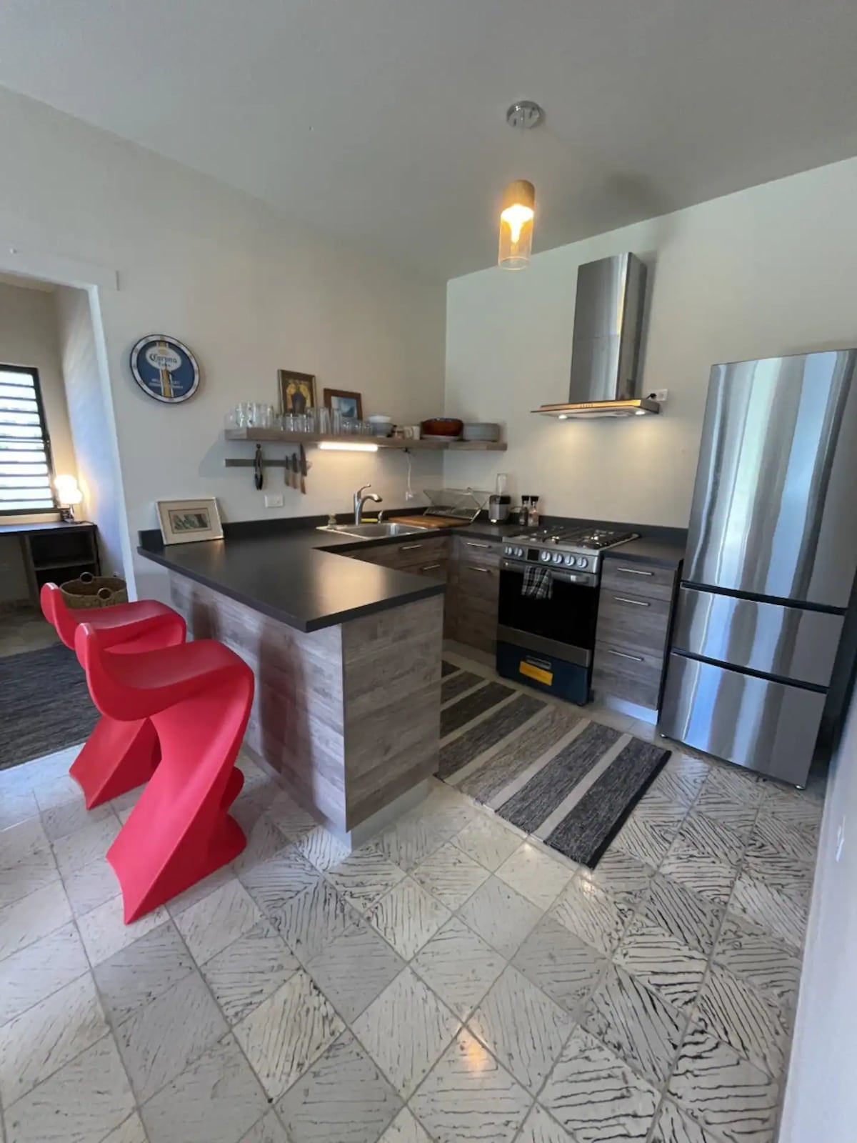 Welcome to Casa Amavida, situated in the tranquil Shacks Beach area of Isabela. This inviting modern home offers two bedrooms, located on a prime lot with lush landscaping walking distance to restaurants and bars. Unwind on the spacious wooden deck, perfect for gatherings beneath the sun. Just a short stroll away, you'll find Shacks Beach, renowned for its beauty. With private parking and new modular construction with a touch of industrialize for your idyllic retreat.