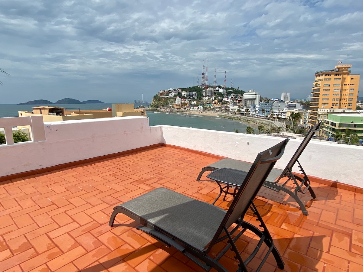 Date un respiro de traquilidad en nuestro bonito lugar, a unas cuadras del hermoso malecón de Olas Altas y a unos minutos del Centro historico , Plazuela Machado,Mercado Pino Suarez, Teatro Agela Peralta el cual fue construido en 1874. Estamos a unos minutos de El Faro natural mas alto del mundo, del Observatorio 1873, Museo de la Ballena y rodeados de bares, restaurantes, cafes donde disfrutaras hermosos atardeceres. Relájate en la alberca infinity con una vista panoramica al antiguo Mazatlán.
