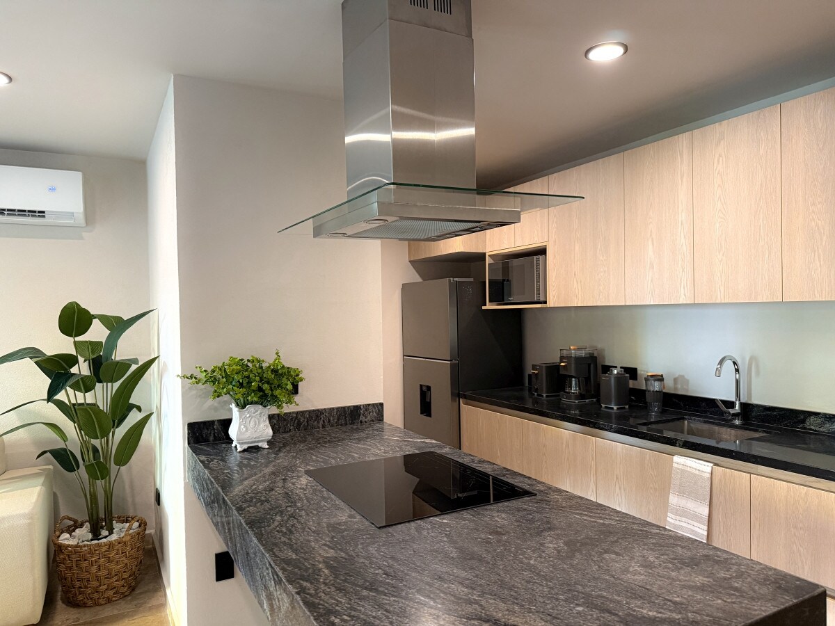 Departamento de una recamara, recientemente renovado con un gran walking-closet y una cómoda cama King. La sala tiene una pantalla plana de 55 pulgadas, una cocina y un refrigerador. Nuestro departamento es espacioso, cómodamente decorado con grandes ventanas. Mantente fresco con A/C y relájate en nuestro colchón luuna. El departamento está equipado con su propio punto de acceso WiFi para una mejor y más rápida conexión.