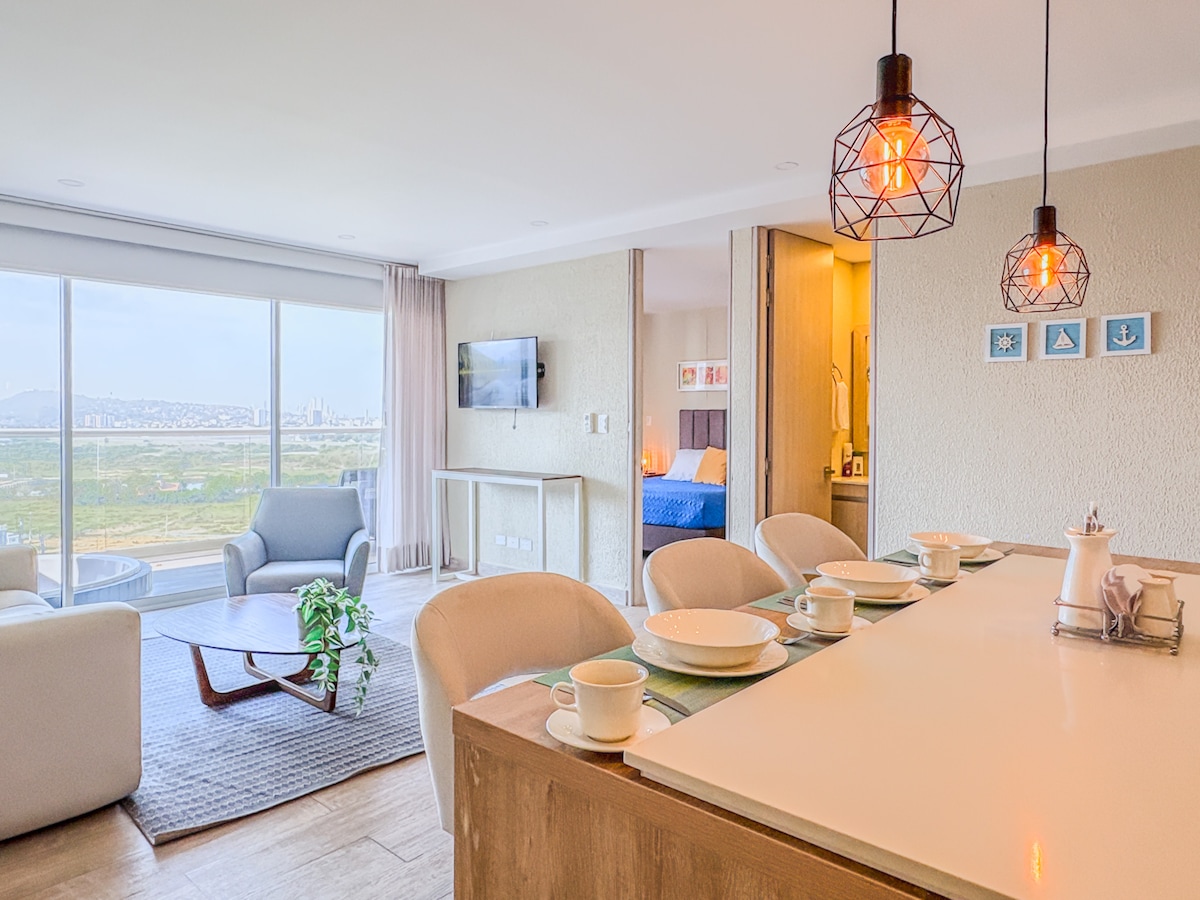 Nuestro elegante apartamento está ubicado en uno de los más completos y modernos edificios del exclusivo sector "Cielo Mar", a pocos metros de una de las mejores playas de la ciudad "Playa azul", a 10 minutos del Centro Histórico y a 5 minutos del aeropuerto. El apartamento tiene una vista Extraordinaria de la Bahía y el Océano que puedes disfrutar desde el Jacuzzi privado en el balcón o en las increíbles Piscinas infinitas en el Rooftop que cuenta Jacuzzis, Sauna, Terraza Bar & BBQ