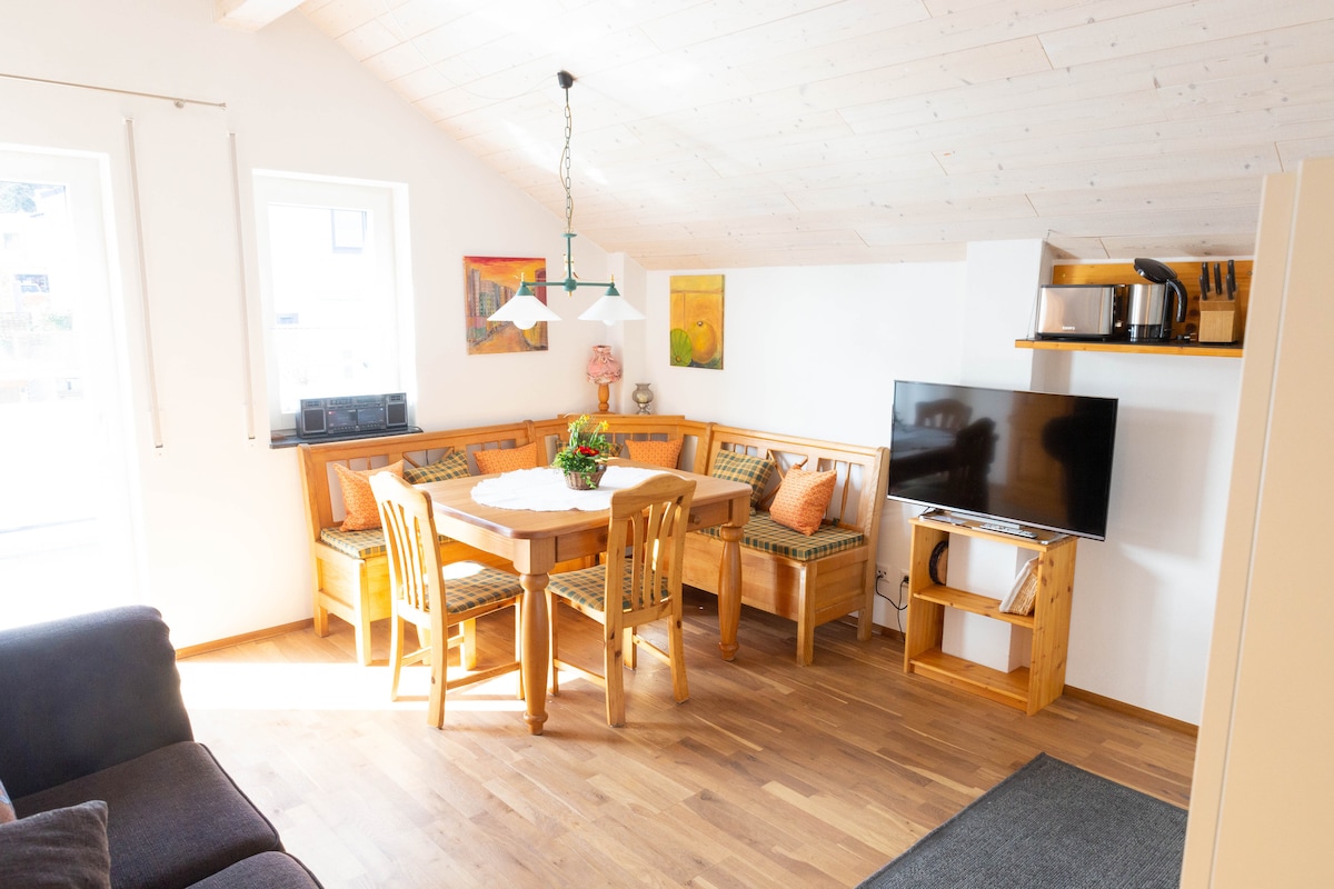 Vivirá cómoda y auténticamente en los 24 metros cuadrados de nuestra «Bauernstüble». En la sala de estar hay un comedor, un armario, un sofá y televisión por satélite. Una escalera conduce a la zona de dormitorio con un colchón de 140 x 200 cm. Junto a la entrada hay una pequeña cocina totalmente equipada. Un moderno cuarto de baño con calefacción por suelo radiante y luz natural completa el apartamento. Se puede utilizar una lavadora + secadora por 4 € por carga de lavado.