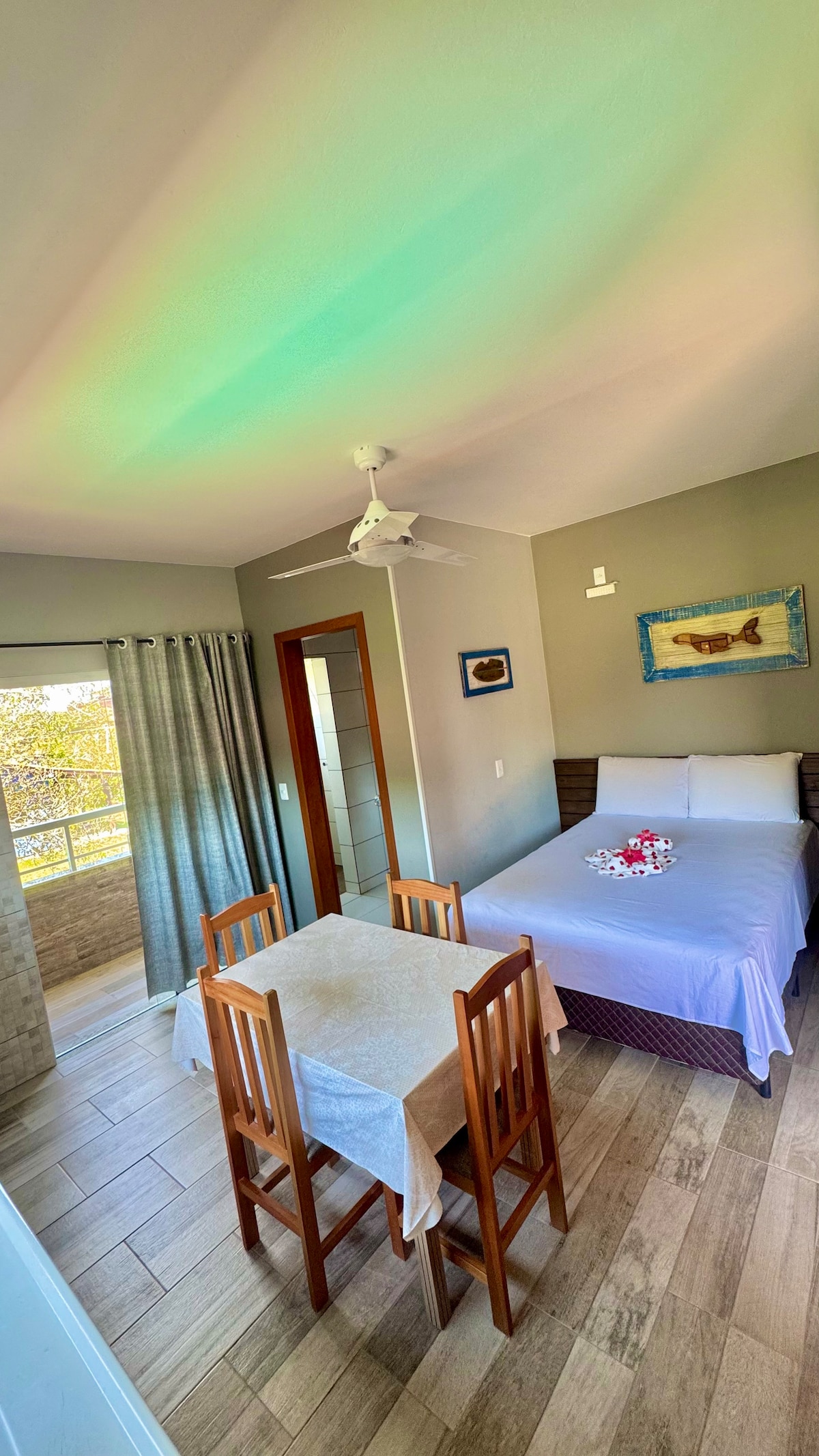 Este es el ESPACIO ITAPIRA, que consta de cuatro residencias de dos pisos. Cada residencia es completamente independiente y tiene su propia estructura. La piscina y la parrilla son compartidas. Cada apartamento tiene dos pisos. El primer piso consta de: SALA DE ESTAR/COCINA, INODORO, TV, sofá cama doble flexible. Arriba: SUITE CON BALCÓN, cama tamaño queen y una cama individual adjunta, baño cómodo. Decoración moderna dirigida al bienestar en una región paradisíaca