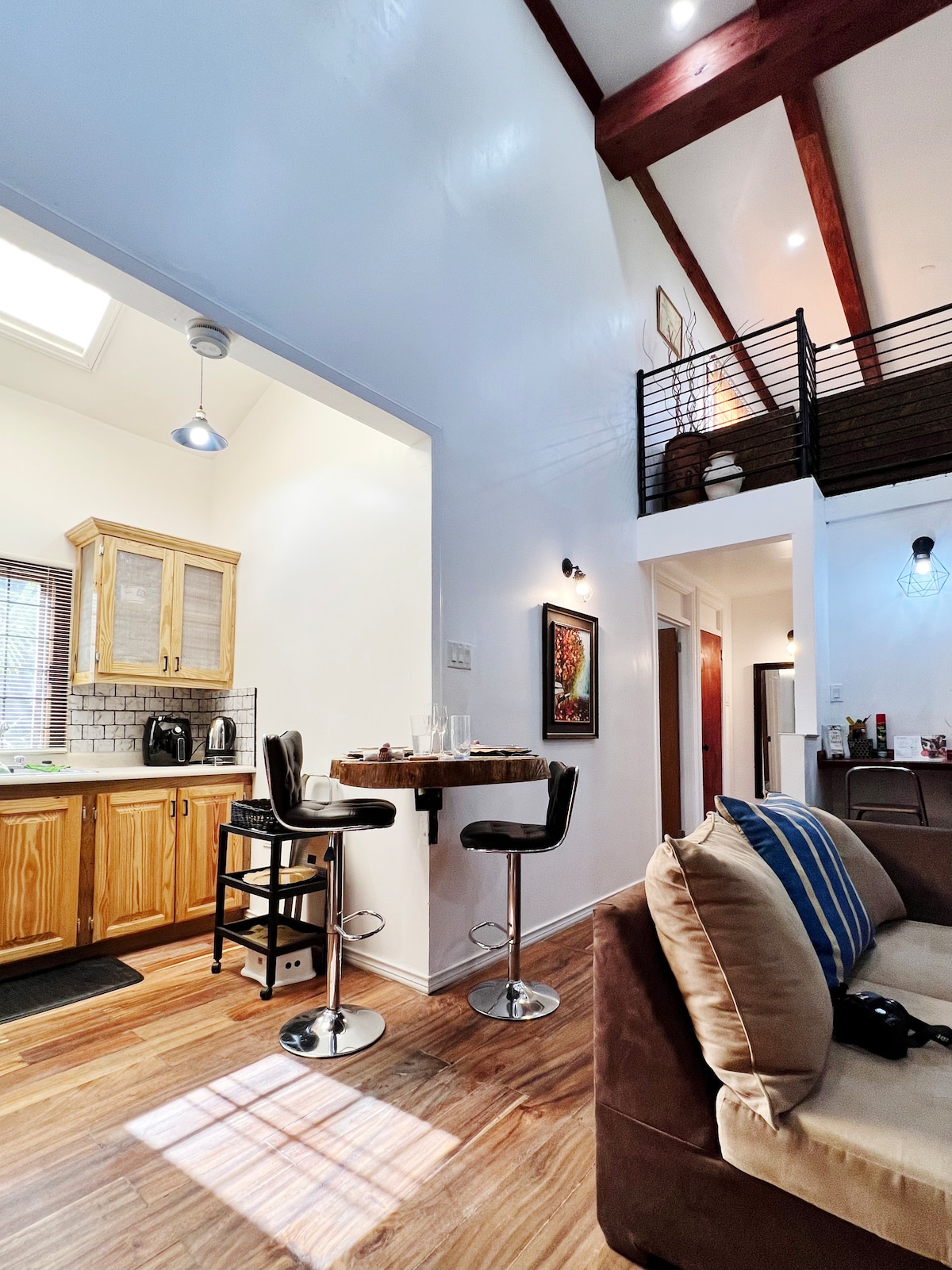 Este espacio espacioso y único es ideal para una escapada cómoda para un grupo pequeño. Se ofrece desayuno local gratuito todos los días. La cabaña/casa de campo tiene dos dormitorios, que pueden alojar hasta cuatro huéspedes. Tiene dos áreas de sala de estar, que incluyen un loft y una esquina especial adecuada para la creatividad, la relajación o la lectura de un buen libro. Es ideal para artistas, escritores y escapadas. La cabaña aislada está situada entre exuberantes árboles, con un fogón, hamaca y el ambiente de pájaros cantando.
