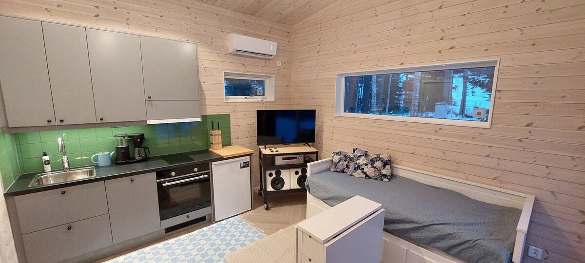 Por fin alquilamos nuestra casa de campo única, recientemente renovada (finalizada en 2022), con 1 habitación y cocina distribuidas en 2 plantas. En la planta baja hay un salón/cocina, cocina con 2 placas, microondas, cafetera y nevera con congelador. Mesa de comedor con capacidad para 4 personas. El baño es una auténtica joya: inodoro, lavabo con un gran banco de almacenamiento y ducha con paredes de cristal. Subiendo una escalera se encuentra el dormitorio, con una cama de 160 cm, un pequeño sofá y un sillón, así como un televisor inteligente giratorio. La casa de la granja está ubicada en el casco antiguo de Gävle, en pleno centro, cerca de todo.