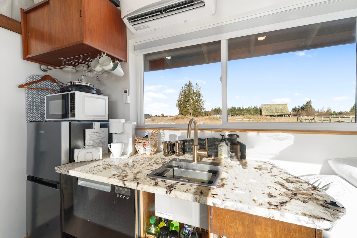 Escápate a nuestra pequeña casa personalizada Blue Moon de 112 pies cuadrados con impresionantes vistas a la montaña. Disfruta de la vida en la granja, vistas impresionantes y la sencillez de la vida en miniatura. Nuestra pequeña cocina cuenta con una cafetera Keurig, barbacoa al aire libre, nevera pequeña, lavavajillas, microondas y placa calefactora. Perfecto para parejas o viajeros solos, disfruta de lujosas comodidades de spa privado, sauna, jacuzzi o visitas al Parque Nacional Olímpico. Observa las estrellas junto al fuego o cena al aire libre. Se admiten perros por una tarifa no reembolsable de 150 dólares.