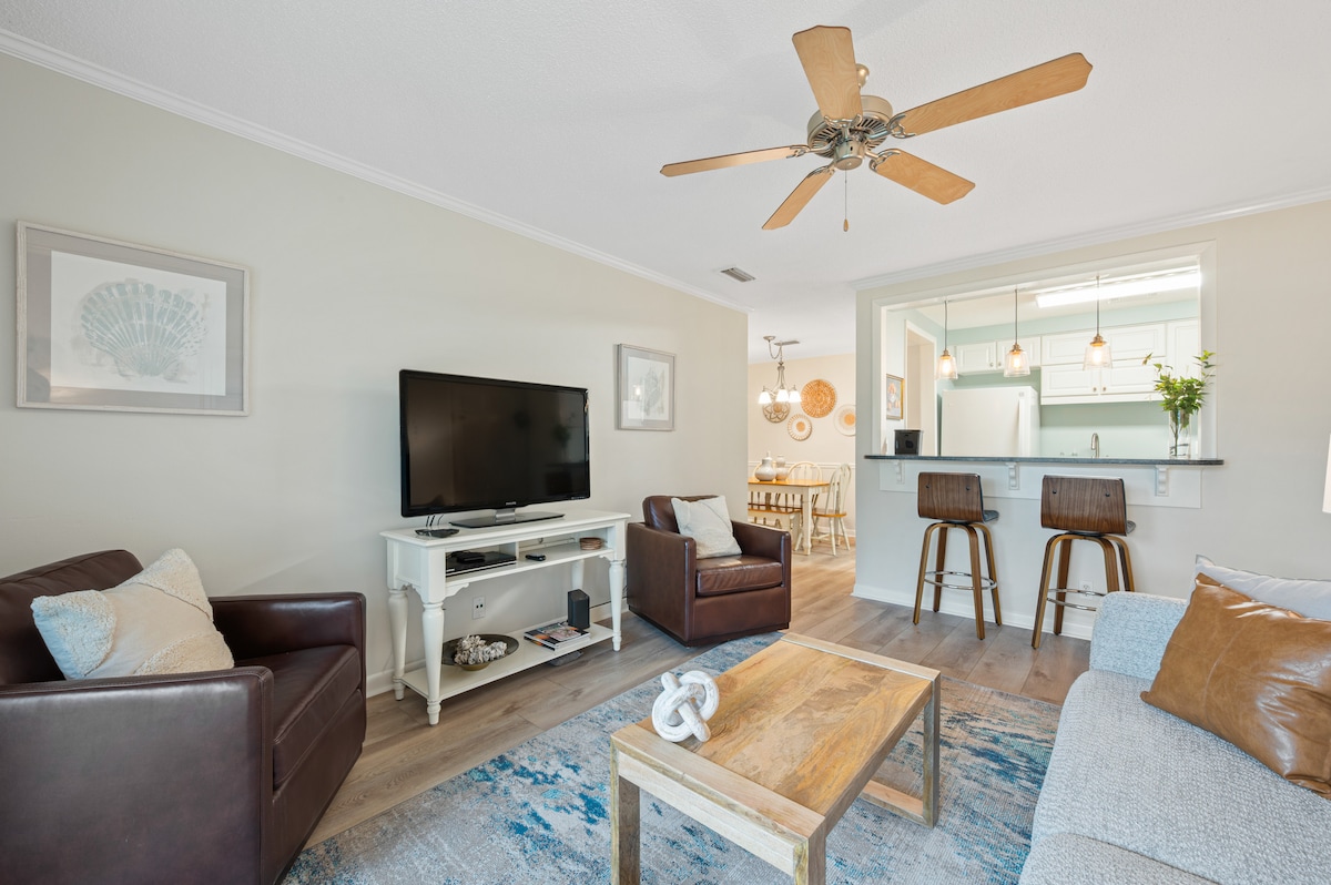 ¡Completamente renovado! Este apartamento recién amueblado es un gran lugar para volver después de explorar todo lo que St. Simons Island tiene para ofrecer. A solo 3 millas de la playa y el área del pueblo, es perfecto para una pequeña familia o pareja. El condominio tiene estacionamiento privado y una gran piscina comunitaria. ¡Disfruta de un cóctel en la terraza privada mientras preparas la cena en la parrilla! Una casa inteligente con Alexa en todas las habitaciones. Puedes tener música en cualquier habitación o en toda la casa, encender y apagar las luces por voz y más.