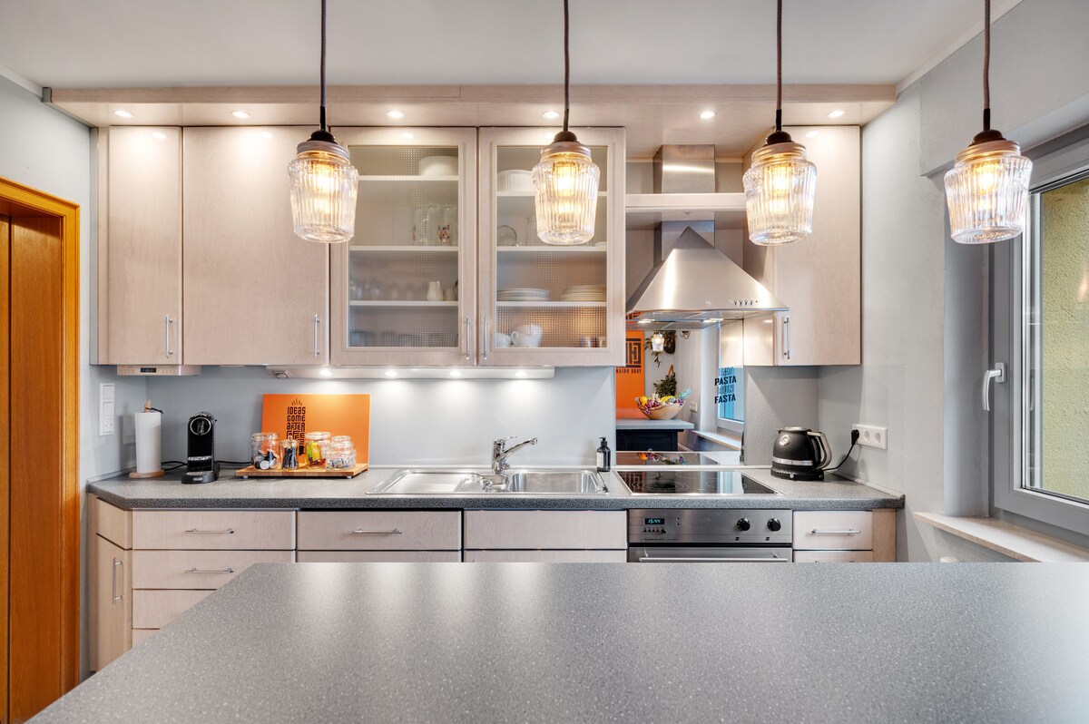 ⭐️“Deja de desplazarte, encontraste el alojamiento que buscas”.⭐️ ✔️Ropa de cama y toallas de alta calidad incluidas. ✔️Lavadora y secadora gratis ✔️Aire acondicionado en todas las habitaciones ✔️ Estacionamiento gratuito justo en la casa ✔️ Amplia cocina con isla de cocina y 4 asientos de bar. ✔️ Ideal para familias y niños: un paraíso para los niños ✔️Conexión rápida a Frankfurt / feria comercial (Messe) ✔️ Patio/jardín privado con puerta con cerradura ✔️ Wifi súper rápido y todos los servicios de streaming Mesa de comedor ✔️ grande para al menos 8 personas