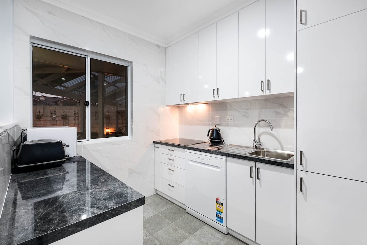 Un hermoso apartamento de nueva construcción, independiente y totalmente amueblado con entrada privada. Estamos ubicados en un barrio hermoso y tranquilo a 20 minutos del centro de negocios de Perth y a pocos pasos de la Universidad Edith Cowan, el Parque Regional Yellagonga y el centro de negocios de Joondalup. Este espacio es ideal para una pareja o una familia pequeña. La capacidad máxima es de 2 adultos y 2 niños. 1 cama tamaño queen. 1 sofá cama dentro de la sala de estar, perfecto para un máximo de 2 niños compartiendo. Aparcamiento gratuito en la parte delantera de la propiedad.