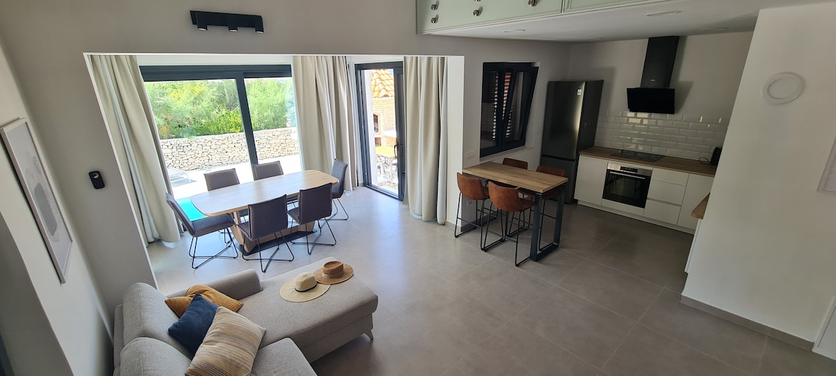 **Nuevo apartamento de piedra cerca del mar con fantásticas vistas al mar**. Apartamento de 55 m2 para 2 + 1 huéspedes. Amplio salón con sofá cama doble (televisión inteligente, aire acondicionado) y cocina (horno, lavavajillas, cafetera). 1. Dormitorio (cama doble grande, armario ancho) con baño (ducha). El apartamento cuenta con terraza privada (10 m2) con increíbles vistas al mar. La terraza contiene una mesa para 4 personas.