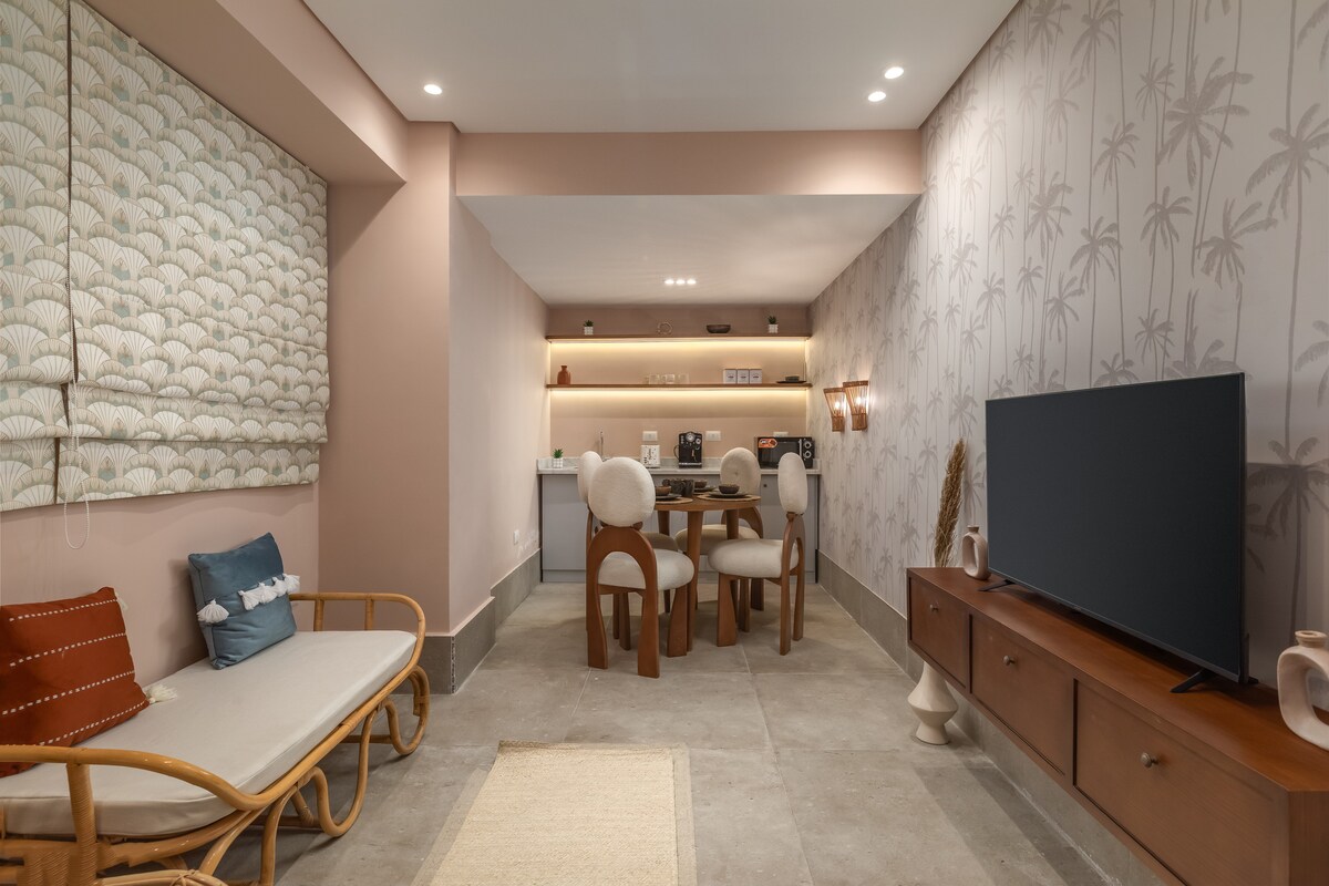 El Khan de las Pirámides, un refugio único donde el diseño artesanal se encuentra con maravillas antiguas. Este sereno apartamento se encuentra en El Haram y ofrece una vista directa de las pirámides desde tu cama o jacuzzi. Cada rincón está lleno de texturas terrosas, piezas seleccionadas y luz natural, diseñadas para la vida lenta, las noches de descanso y las mañanas mágicas con una vista que es realmente inolvidable. Ya sea que seas una pareja, un viajero solitario o un alma creativa que busca inspiración, este Khan es tu refugio en Giza.