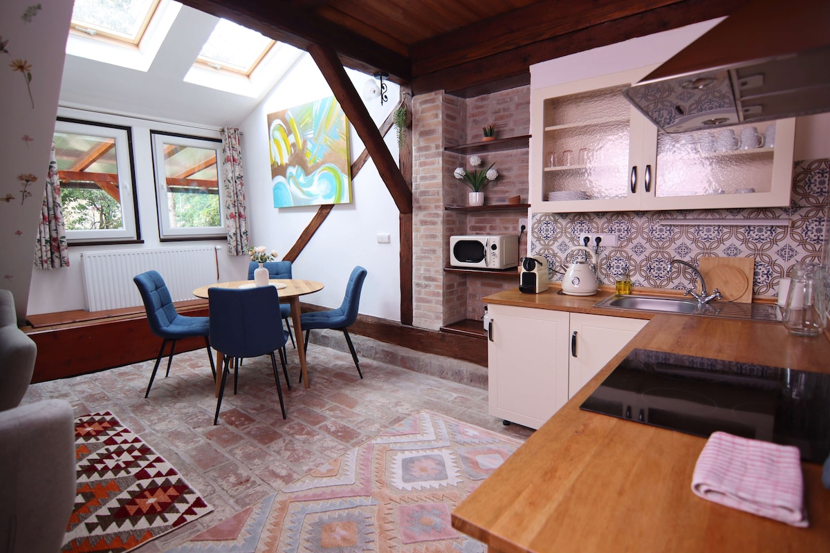 Apartamento tranquilo y romántico en pleno centro con vistas al castillo, con suelos de madera originales renovados, cocina totalmente equipada con electrodomésticos y cafetera. El apartamento tiene su propio baño con inodoro. TV SMART con Netflix y WIFI de alta velocidad. ¡Está prohibido fumar! TAMPOCO SE PERMITEN PERROS debido a los suelos históricos. El apartamento está diseñado como una habitación parcialmente separada con una cama doble y una cocina con un sofá pequeño, donde otra persona puede dormir si es necesario. Planta baja elevada, 7 escalones.