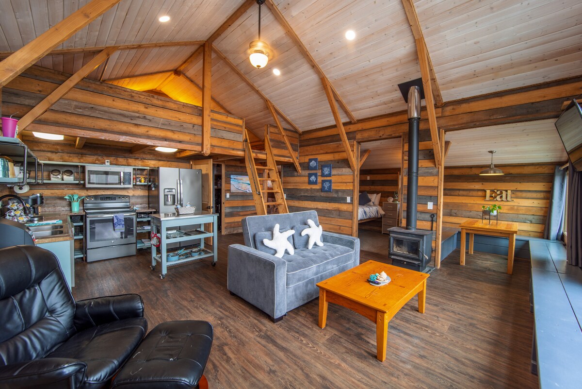 Retiro de lujo con vistas al mar y paisajes inolvidables de Alaska. Disfruta de vistas panorámicas de Cook Inlet y de las puestas de sol volcánicas. Relájate en un baño tipo spa con bañera de hidromasaje, ducha doble a ras de suelo y tocador doble. El espacio abierto de estilo estudio ofrece una chimenea de gas, una lujosa cama tamaño king y terrazas para el amanecer y el atardecer. La cocina personalizada incluye una estufa de gas, microondas y cajones compactos de refrigerador/congelador. Las ventanas arquitectónicas distintivas llenan el hogar con luz natural durante los largos días de verano de Alaska.