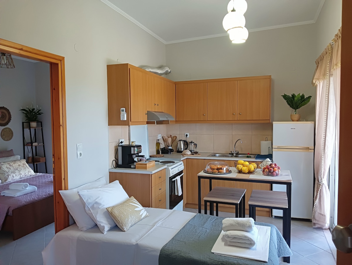 El espacioso apartamento de 2 dormitorios de Myrtia con terraza verde es un nuevo apartamento en planta baja en el pueblo de Korfalonas. Las grandes puertas de la terraza dan acceso inmediato al hermoso y relajante jardín verde. Este apartamento de nueva construcción es moderno con detalles acogedores, que te dan una sensación relajante. Tiene capacidad para familias y parejas.