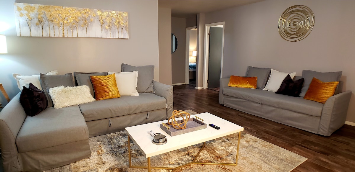 Se admiten mascotas. (Se aplican tarifas por mascotas). Enorme apartamento de 3 dormitorios con dos salas de estar adicionales/habitaciones multiusos. Duerme hasta 16 personas. 4 sofás cama tamaño queen Televisor inteligente 4K de 55 pulgadas en el primer salón TV inteligente 4K de 75 pulgadas en el dormitorio de usos múltiples.
