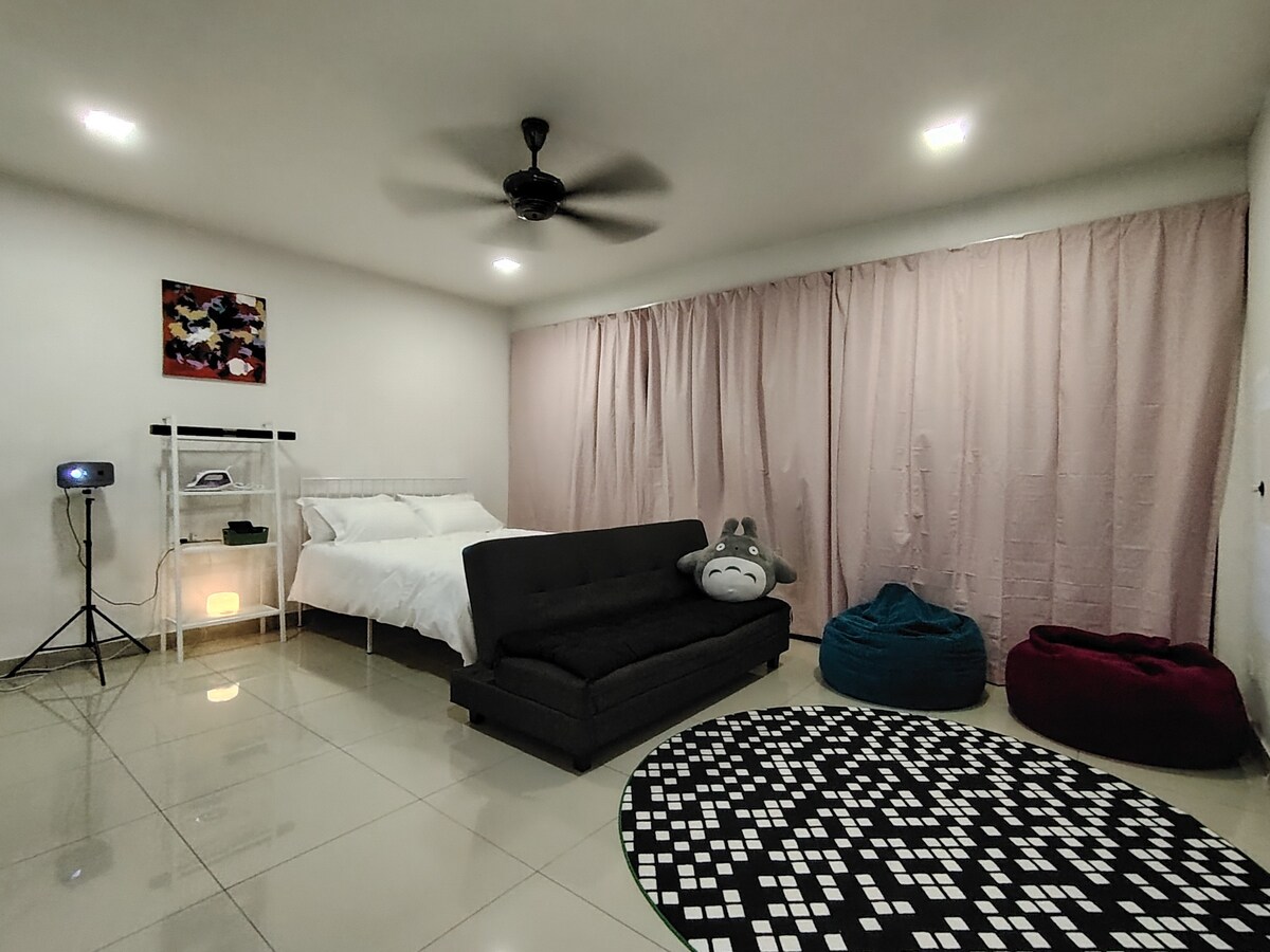 Disfruta de la sencillez de este alojamiento tranquilo y céntrico. Nueva habitación estudio amueblada en Trefoil Setia Alam (HOME CINEMA) Estamos ubicados en Setia Alam, Shah Alam, justo al lado del centro comercial Setia City y del centro de convenciones Setia City (SCCC). A muy poca distancia del NIH, Top Glove HQ y Sunsuria Forum. El espacio Distribución de las camas para 2 huéspedes: - Cama tamaño queen x 1 - Puff XXL x 2 Lo que ofrecemos: - Proyector inteligente de 150 pulgadas (preparado para Netflix, YouTube, etc.) - Wifi de 500 Mbps.