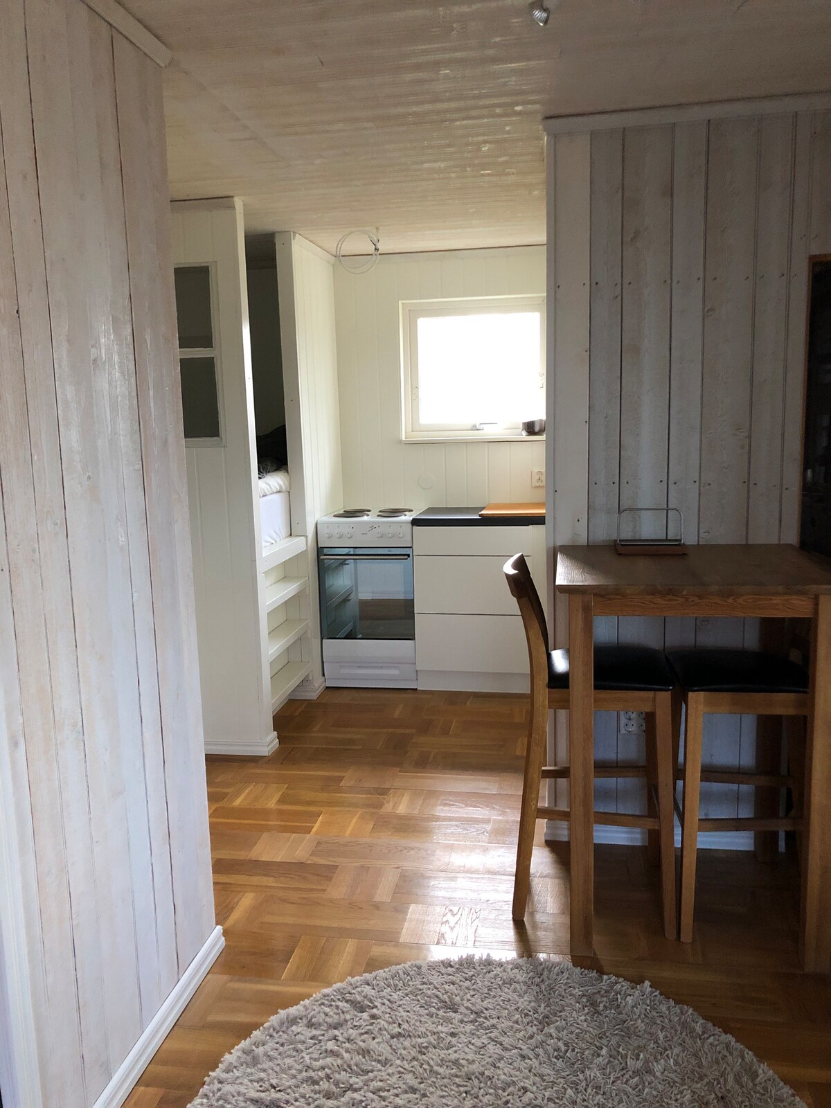 Alojamiento pequeño pero espacioso (25 m2 + altillo) luminoso y acogedor, cómodo y confortable. Cerca (150 m) del lago, baño y relajación. Relájate en este alojamiento único y tranquilo. Moderno, construido en 2018, con calefacción durante todo el año y con todas las comodidades. En verano, acceso a un cenador en la parcela si se quiere un poco más de espacio para socializar. Pasea por los hermosos alrededores, corre por la bonita pista de ejercicio de Kilenegården, monta en bicicleta o alquila una tabla de paddle surf.