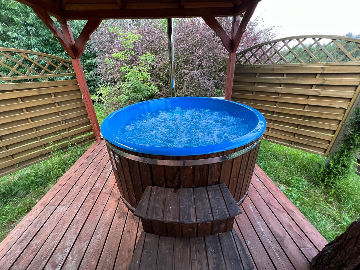 La casa Bielawy ha sido especialmente diseñada para la relajación. Cuenta con una moderna piscina climatizada sin cloro (oxígeno activo) con un banco de masajes, un jacuzzi para 6 personas y una sauna de alta calidad. ¡El amplio jardín incluye un parque infantil, mesa de ping pong, barras trepadoras, cama elástica y cancha de voleibol! Dentro de la casa, los huéspedes pueden relajarse junto a la chimenea, jugar al futbolín, a la Xbox o al póquer. La cocina bien equipada ofrece las condiciones ideales para cocinar. Muy cerca hay hermosos lagos y bosques.