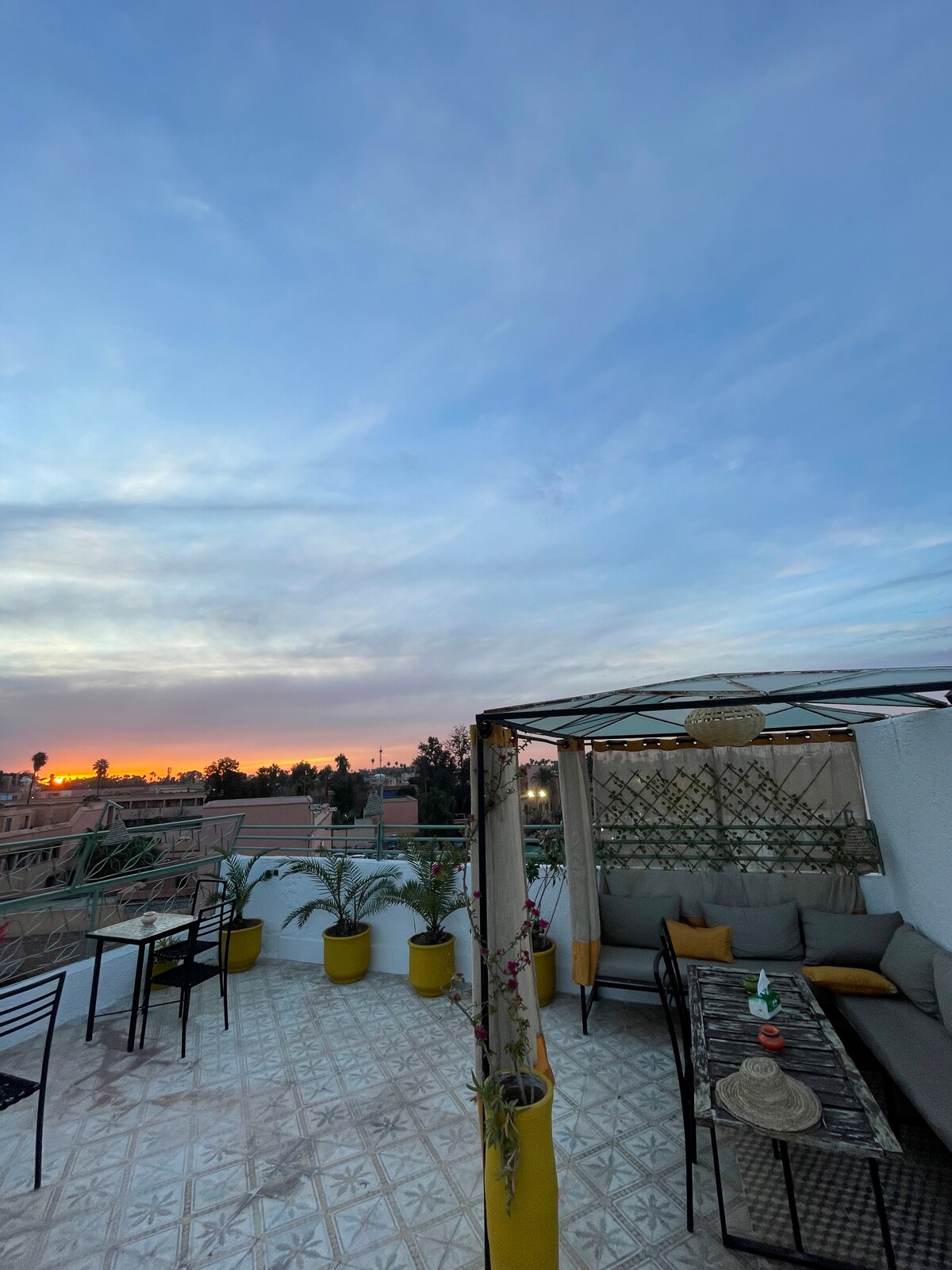 Notre Riad est une promesse d'évasion. Imaginez vos matinées bercées par le chant des oiseaux dans le patio et vos soirées sur notre terrasse surplombant la ville rouge.Un mélange raffiné de zelliges traditionnels et de confort contemporain. Un salon de lecture cosy pour s'évader,des chambres élégantes pour se ressourcer. Un patio rafraîchissant, pour le café du matin, un rooftop pour savourer le coucher du soleil.Hospitalité marocaine et confort absolu:votre parenthèse enchantée commence ici.