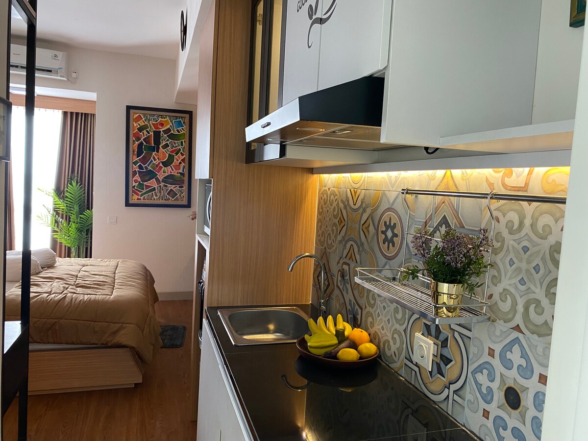 ¡Quédate con estilo! Yogyakarta Octavo piso con encantadora vista a la ciudad ✨ Interior moderno y acogedor: Diseño estético de la habitación con un toque de paneles de madera, iluminación blanca cálida y relajante y elegantes decoraciones de pared. Oferta especial en el octavo piso: Posición ideal del piso para obtener la mejor vista sin el ruido de la calle principal. Totalmente amueblada: Equipado con una hermosa cocina con azulejos de bloqueo, nevera, microondas, TV, aire acondicionado y una cómoda zona de trabajo/estudio.