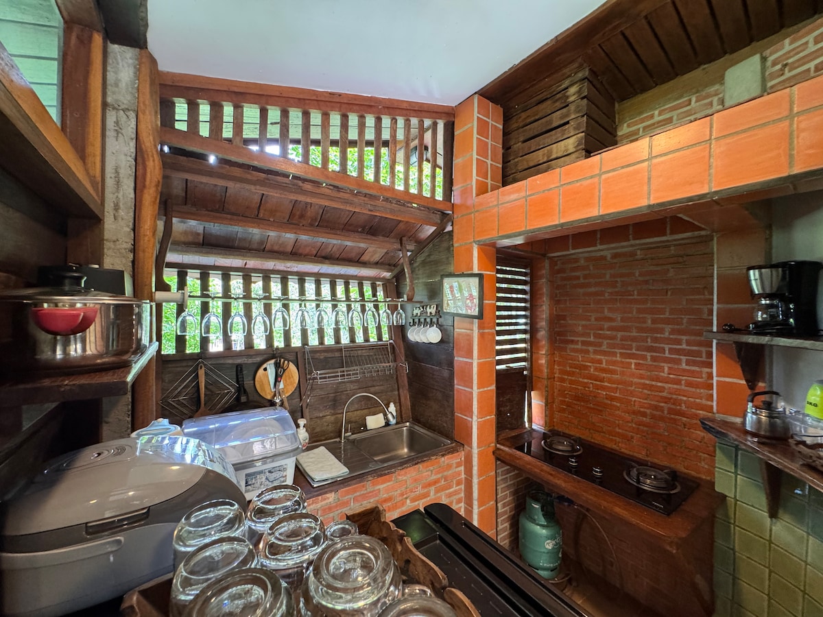 Imagínate en una casa de madera de pino en medio de vastos prados y árboles. Relájate en un amplio balcón de madera con un café, disfrutando de las impresionantes vistas de Khao Yai. En el interior, el aroma a pino y la luz del sol llenan el acogedor espacio. Las comodidades incluyen unidades de aire acondicionado, TV de 50 pulgadas, wifi y baño con ducha de efecto lluvia. La cocina al aire libre tiene una estufa eléctrica, microondas, tostadora y nevera. Disfruta de amaneceres dorados, impresionantes puestas de sol y observación de estrellas desde la azotea con vistas de 360 grados de Khao Yai.