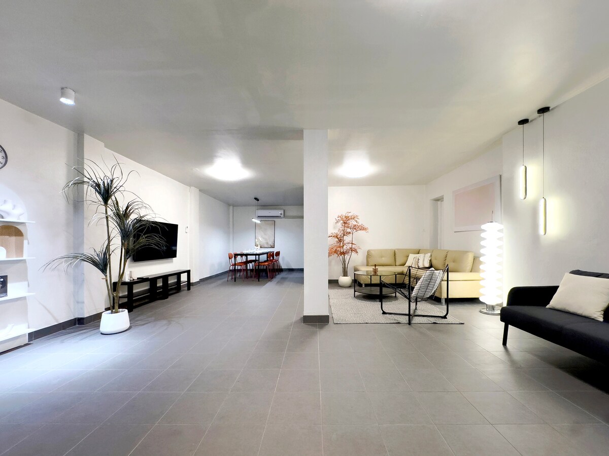 La sala de techo simple y alto. Está en la planta baja del edificio en Rama4, Pathumwan, que es de fácil acceso a la carretera Banthat Thong (mucha comida callejera) en unos minutos a pie. Siam Square, MBK y China Town también están a poca distancia. Dusit Central Park y Lumpini Park están a solo 2 paradas en Mrt. Es una habitación luminosa y limpia, apta para 2 hasta 3 personas, con sofá cama adicional. Puedes disfrutar de un ambiente relajante en Centenary Park en un paseo muy corto:)