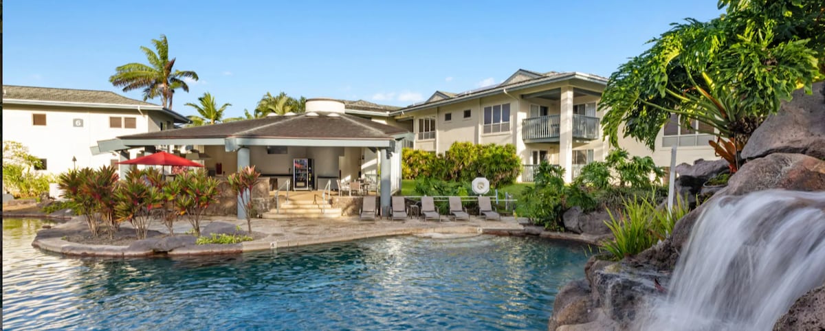 Disfruta de un increíble amanecer desde tu patio privado, con vistas al hermoso parque de playa Nukoli 'i, con una pequeña vista al mar. Estás a solo un par de minutos a pie de la playa. Ubicado en el edificio 3 del Kauai Beach Resort and Spa, un centro vacacional de 4 estrellas en la ubicación perfecta. A solo 10 minutos en auto del aeropuerto y de la ciudad de Lihue, pero ubicado justo en la playa de Kauai. ¡El centro vacacional incluye dos piscinas, dos jacuzzis, bar de playa, gimnasio, 2 restaurantes, servicio de conserjería/vestíbulo e incluso un tobogán acuático!