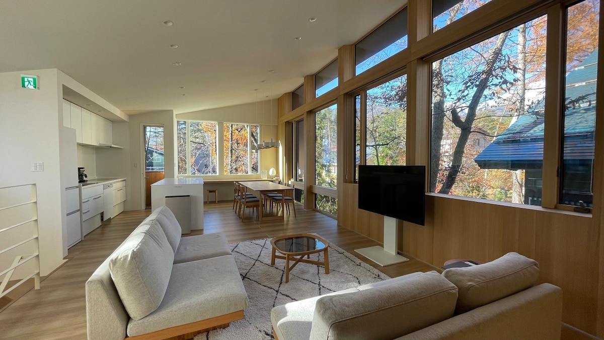Located in Wadano woods with a breathtaking view overlooking the Happo Resort slopes, it is a beautifully designed timber-framed house. A perfect location overlooking the slopes of Happo Resort. Nestled in a quiet forest, this stylish villa offers a million-dollar view from the wide windows. Guests can enjoy the pleasure of looking out at the ski slopes while taking a relaxing bath. Spend a luxurious vacation at Fuku Chalet with an unforgettable view!